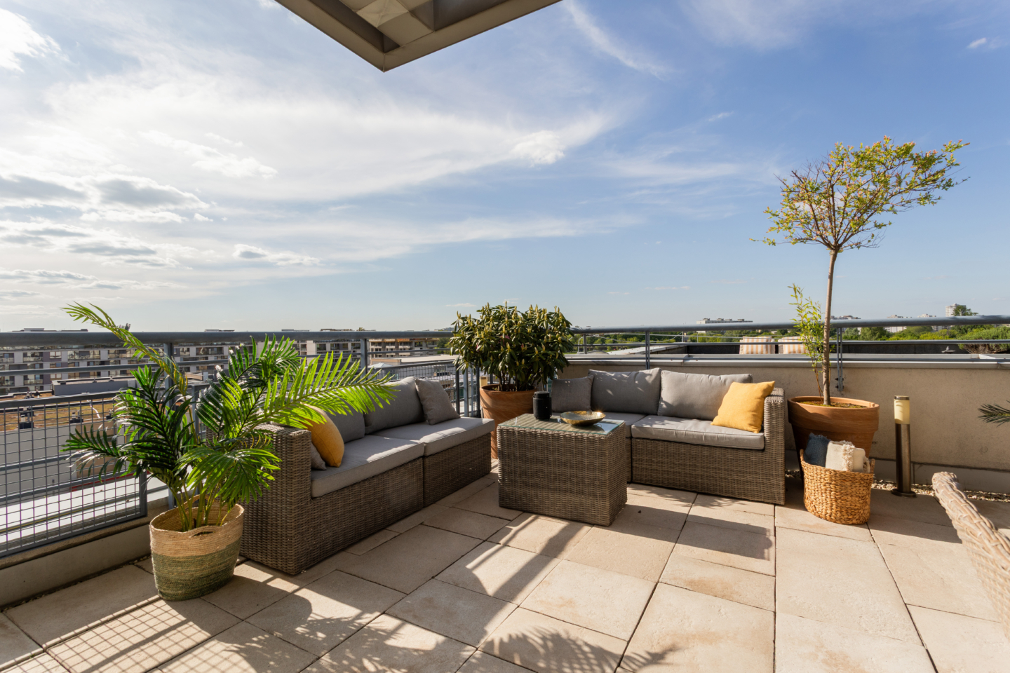 The terrace furniture, which can be seen in the photos, can remain in place - perfectly matched to the space, creating a ready-made lounge area.