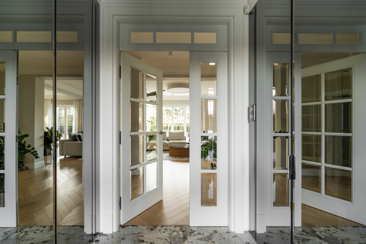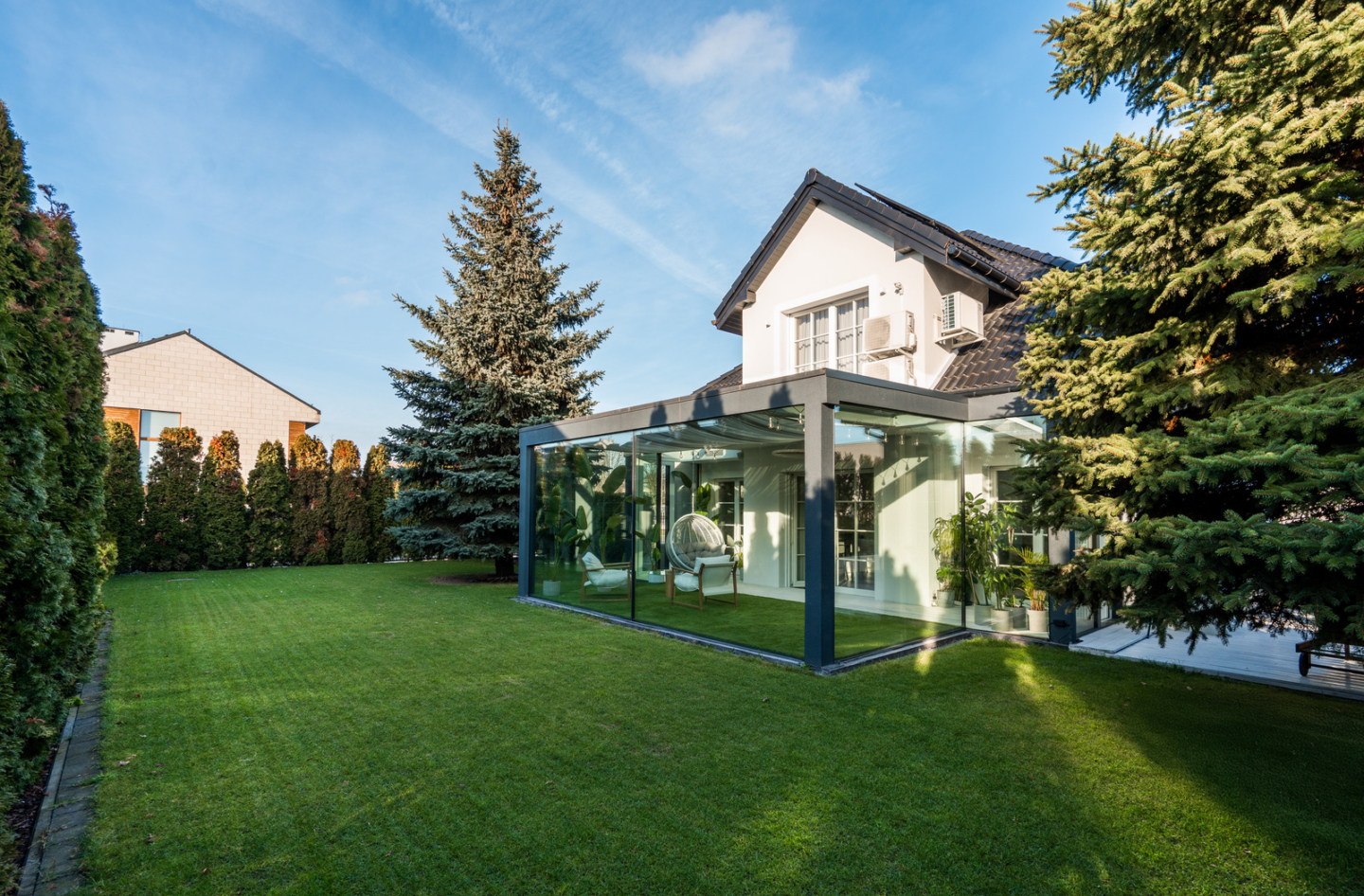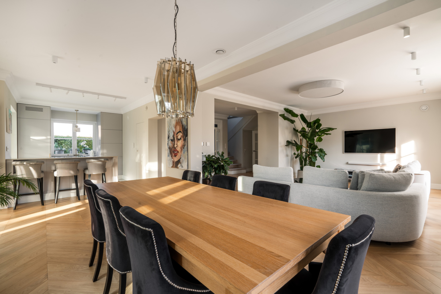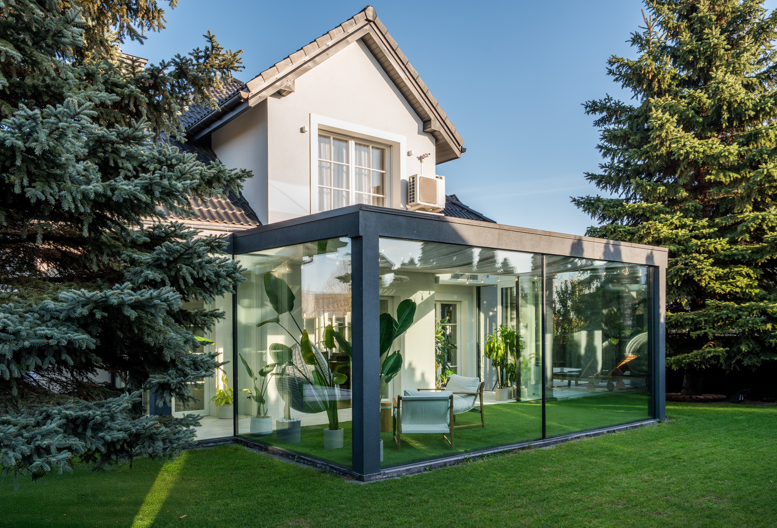 The 325 m² house impresses with its functional layout and rich furnishings. The first floor is an open living area with a living room, dining room and kitchen with an island and a glazed orangery full of greenery (30 m²). On the first floor are bedrooms with private bathrooms and dressing rooms, including a master suite with a Villeroy&Boch freestanding bathtub and controllable blackout curtains. The interiors are finished with natural French herringbone wood, quartz and unique Dubinsky woodwork. The house is equipped with air conditioning in every room, SONOS sound system, water filtration and integrated Apple Home control. The whole is complemented by a private gym and a wine cellar.