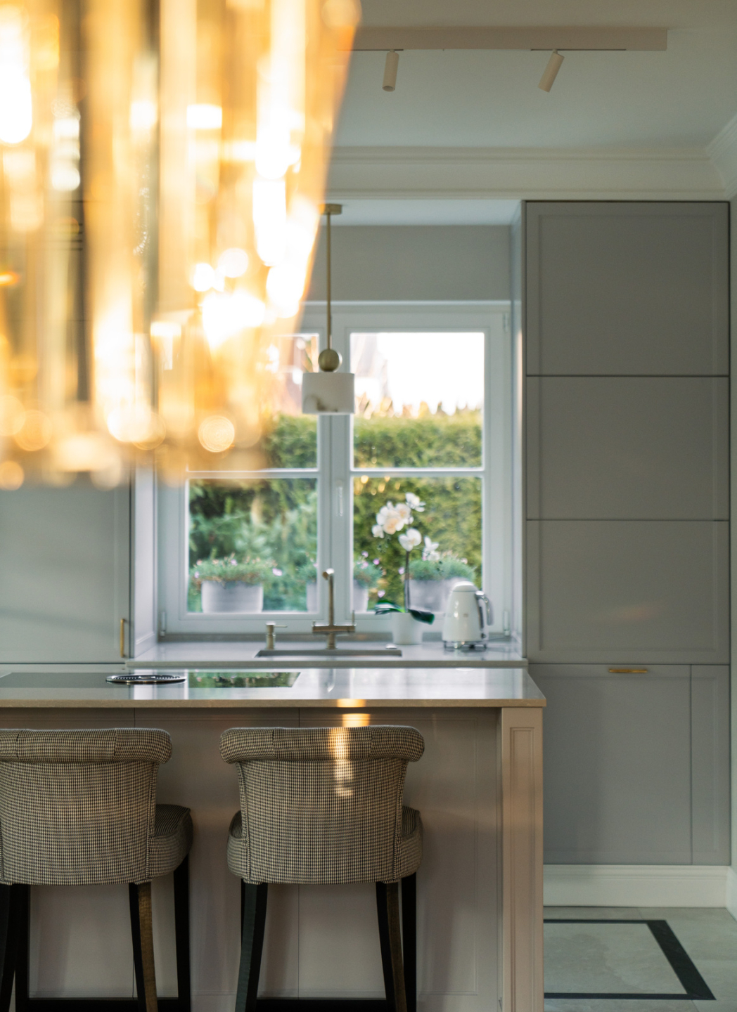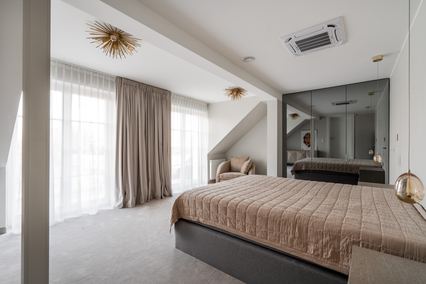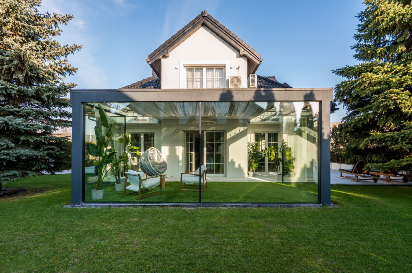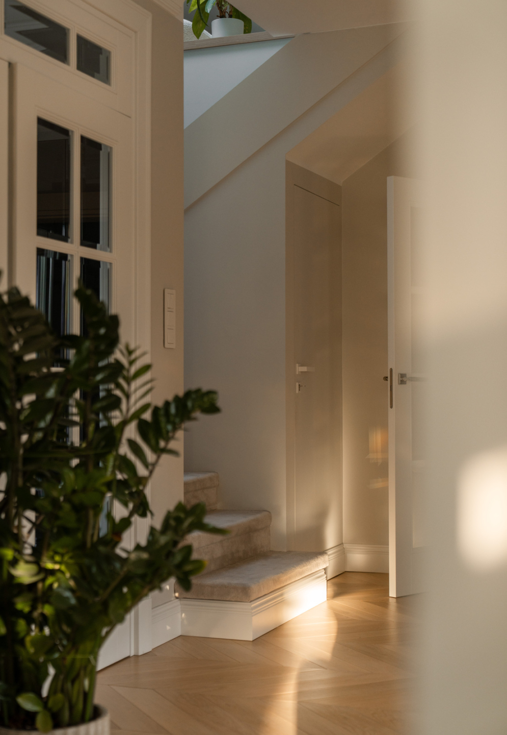 The 325 m² house impresses with its functional layout and rich furnishings. The first floor is an open living area with a living room, dining room and kitchen with an island and a glazed orangery full of greenery (30 m²). On the first floor are bedrooms with private bathrooms and dressing rooms, including a master suite with a Villeroy&Boch freestanding bathtub and controllable blackout curtains. The interiors are finished with natural French herringbone wood, quartz and unique Dubinsky woodwork. The house is equipped with air conditioning in every room, SONOS sound system, water filtration and integrated Apple Home control. The whole is complemented by a private gym and a wine cellar.