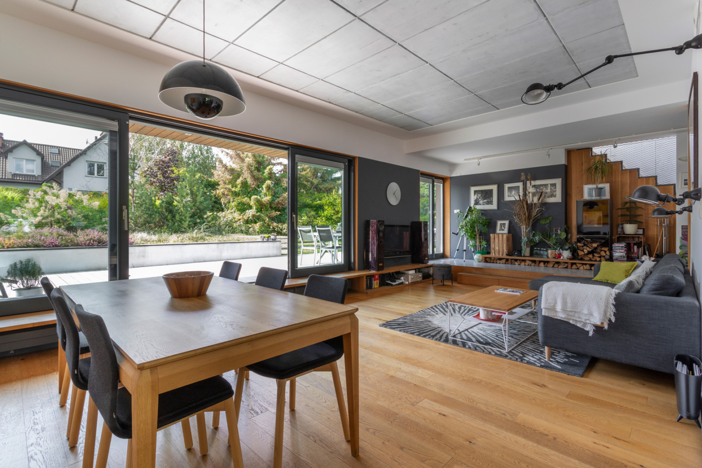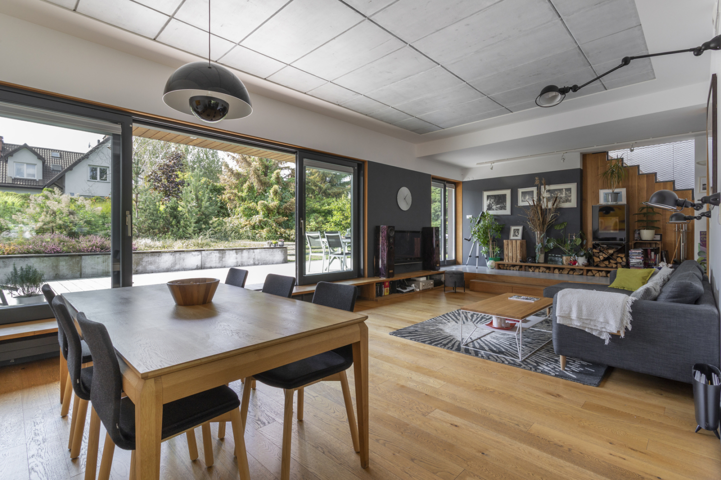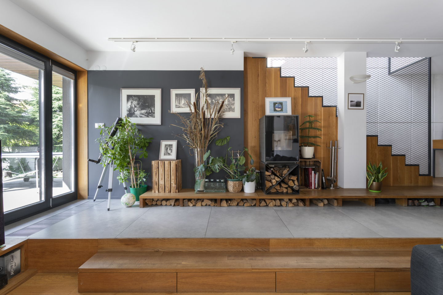 The living room features a fireplace by German brand Wodtke, which exudes raw elegance