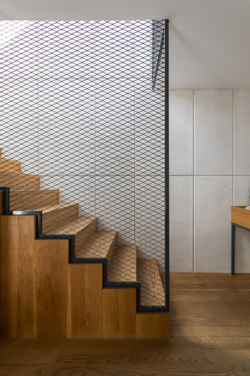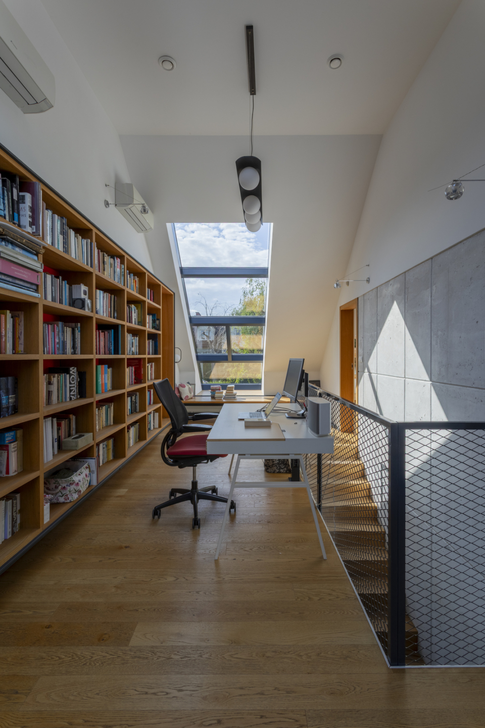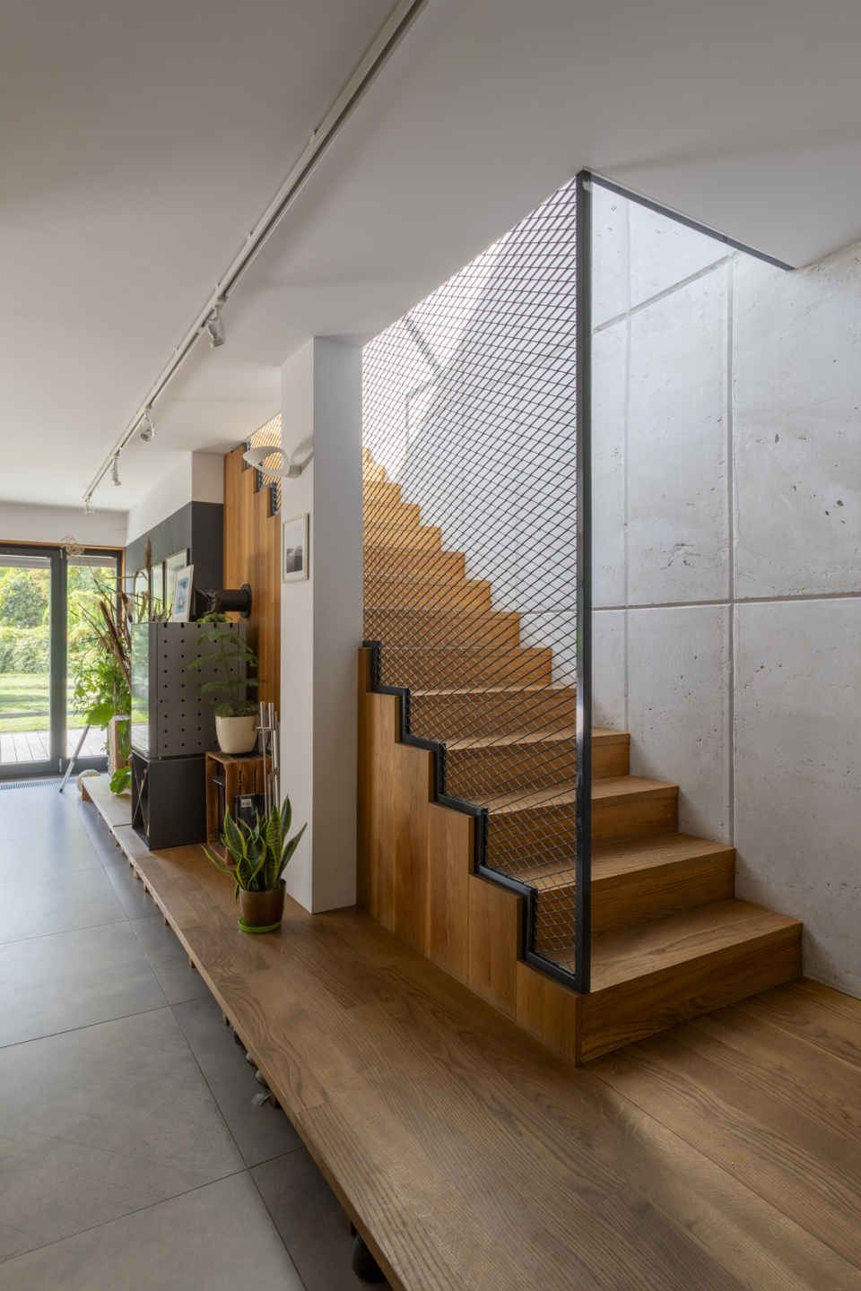 A unique single-family semi-detached house (it is connected with the neighboring building only by the wall of the utility room) was designed to combine style and functionality in a modern body. Thanks to this, an interior of above-standard height was created, full of light coming in through numerous windows and huge skylights in the roof. Finishing materials give the property a unique character and create a mood of harmony. The heated floors are lined with oak planks made by Swedish company Kahrs, the living room ceiling and the staircase wall are decorated with panels handcrafted from polished and bleached architectural concrete.