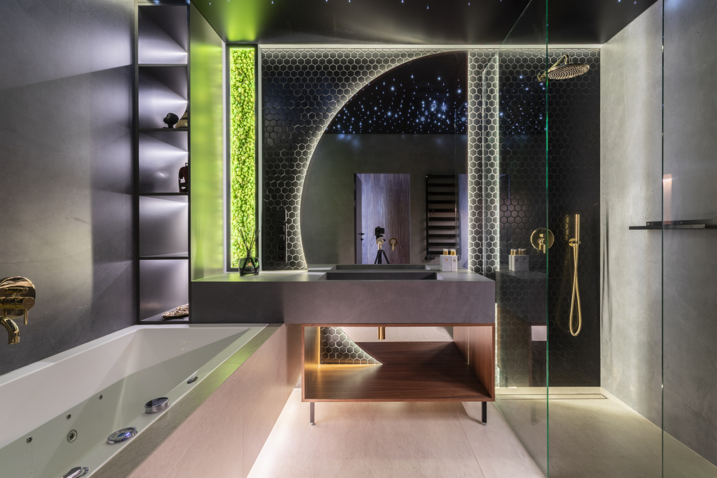 Na górnym poziomie mieści się komfortowa sypialnia główna z imponującą garderobą i balkonem, gabinet lub dodatkowy pokój oraz duża łazienka z wanną.
