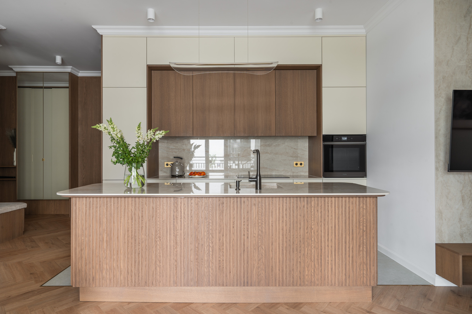 Mieszkanie wykończone, według indywidualnego projektu. Całość spójna stylistycznie, utrzymana w stonowanej, eleganckiej kolorystyce. Wysoki standard wykończenia: meble wykonane na wymiar przez stolarza, wysokiej klasy armatura i zabudowy, nowoczesne oświetlenie, dopracowane detale.