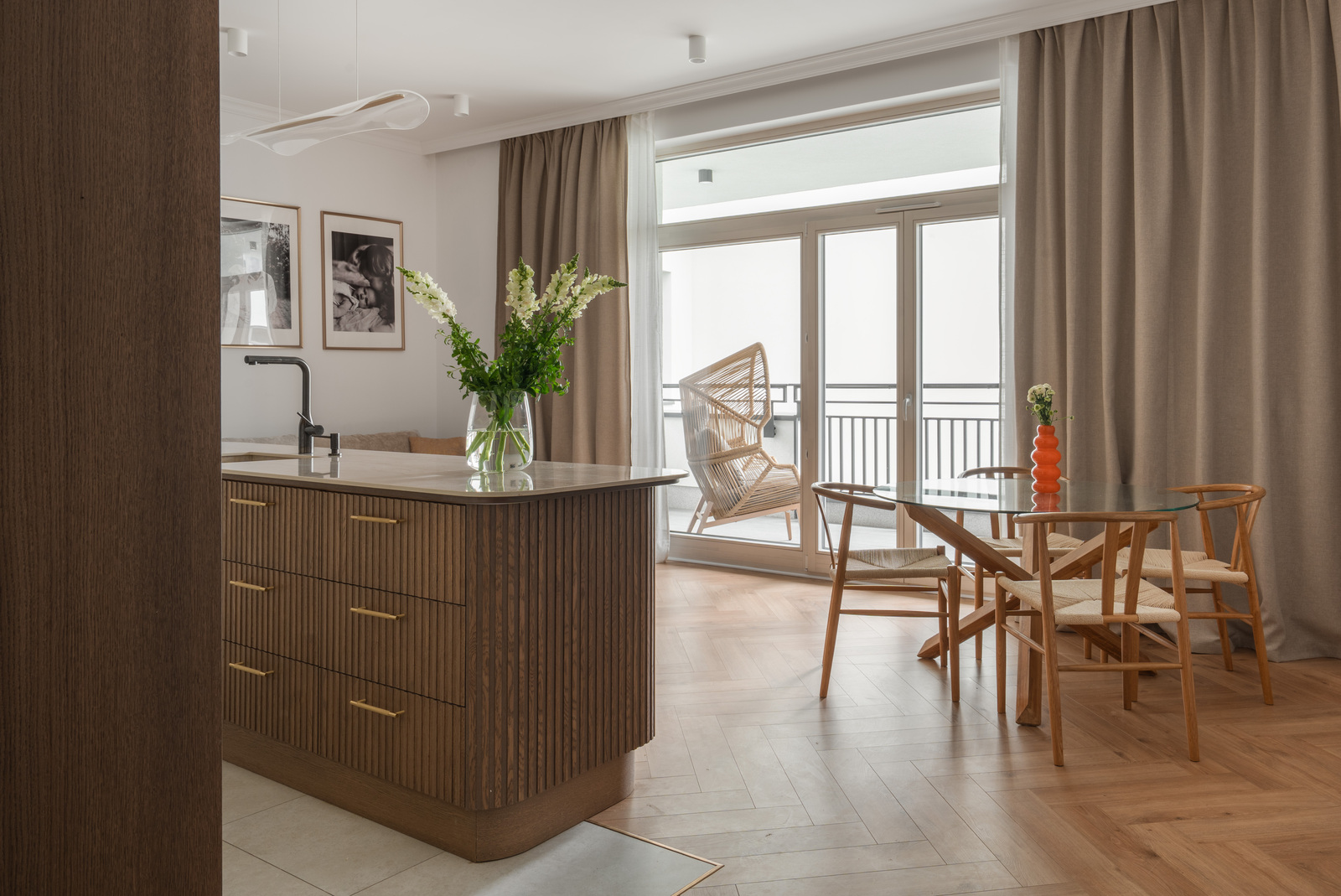 •przestronny salon z wyjściem na balkon i dużymi przeszkleniami, połączony z nowoczesną kuchnią w zabudowie,
