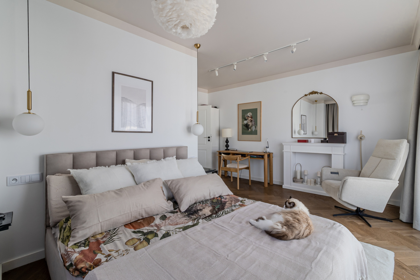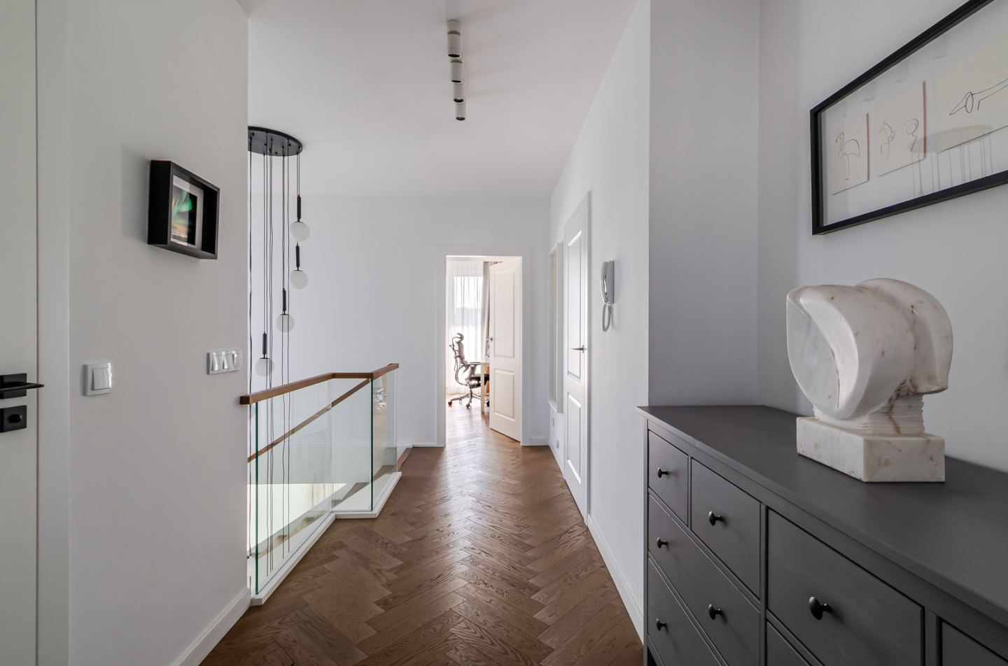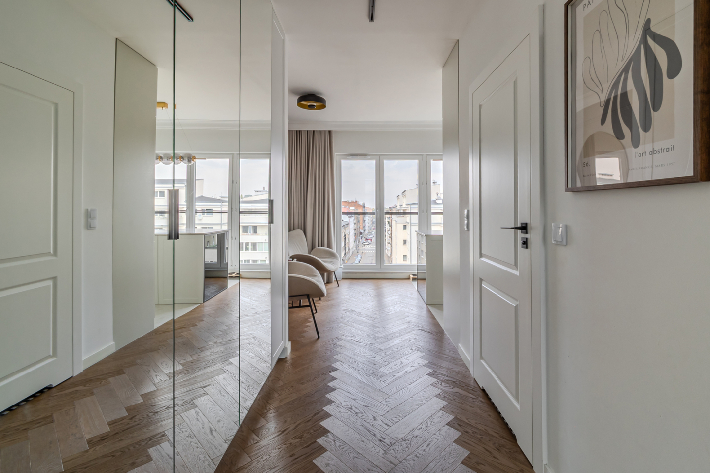 Mieszkanie zachwyca wysokim standardem wykończenia oraz funkcjonalnością. Wnętrze jest nowoczesne, a przy tym ciepłe i spójne. Niewątpliwą zaletą jest piękna, drewniana podłoga, ułożona w klasyczną jodełkę, która dodaje wnętrzu charakteru, jednocześnie czyniąc je wyjątkowo przytulnym.