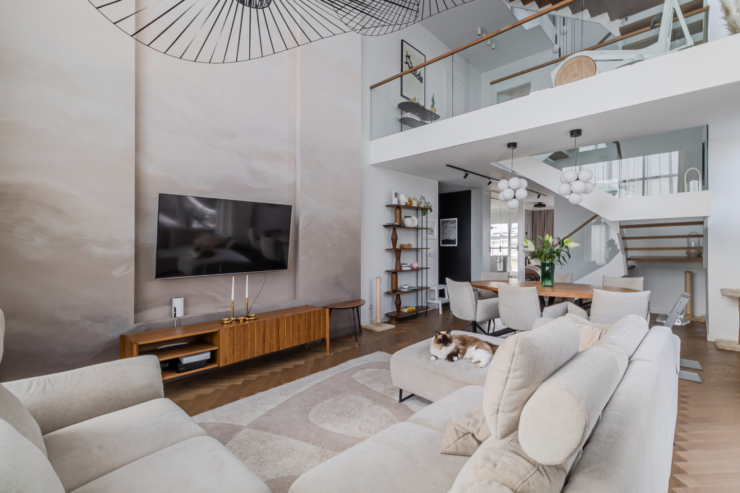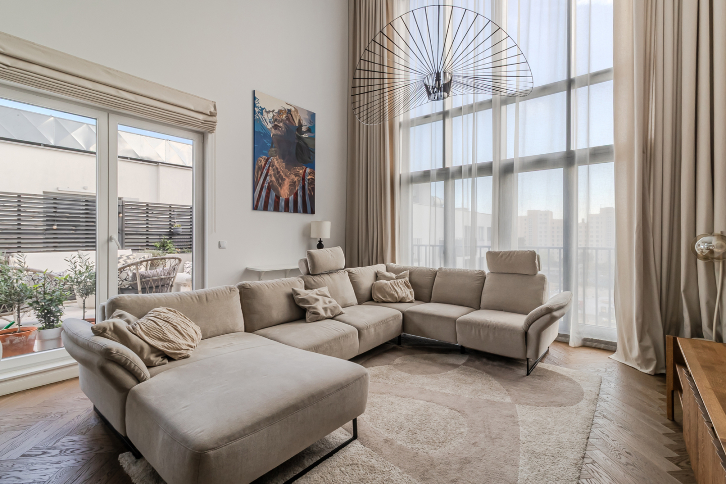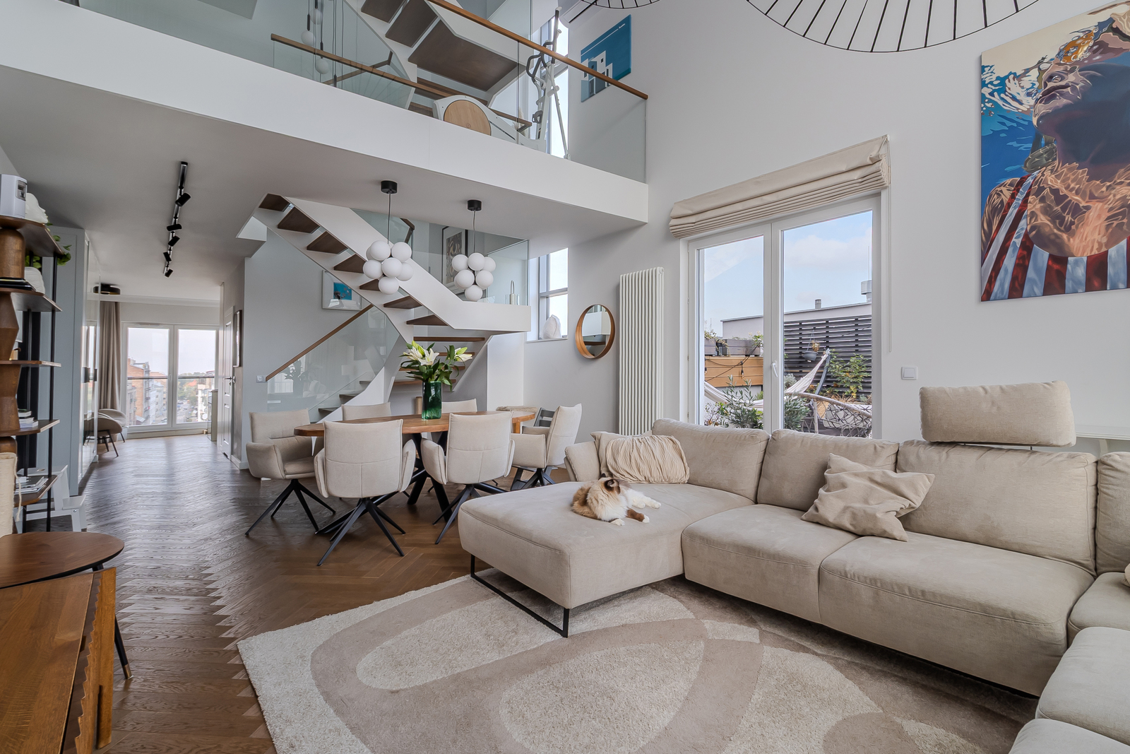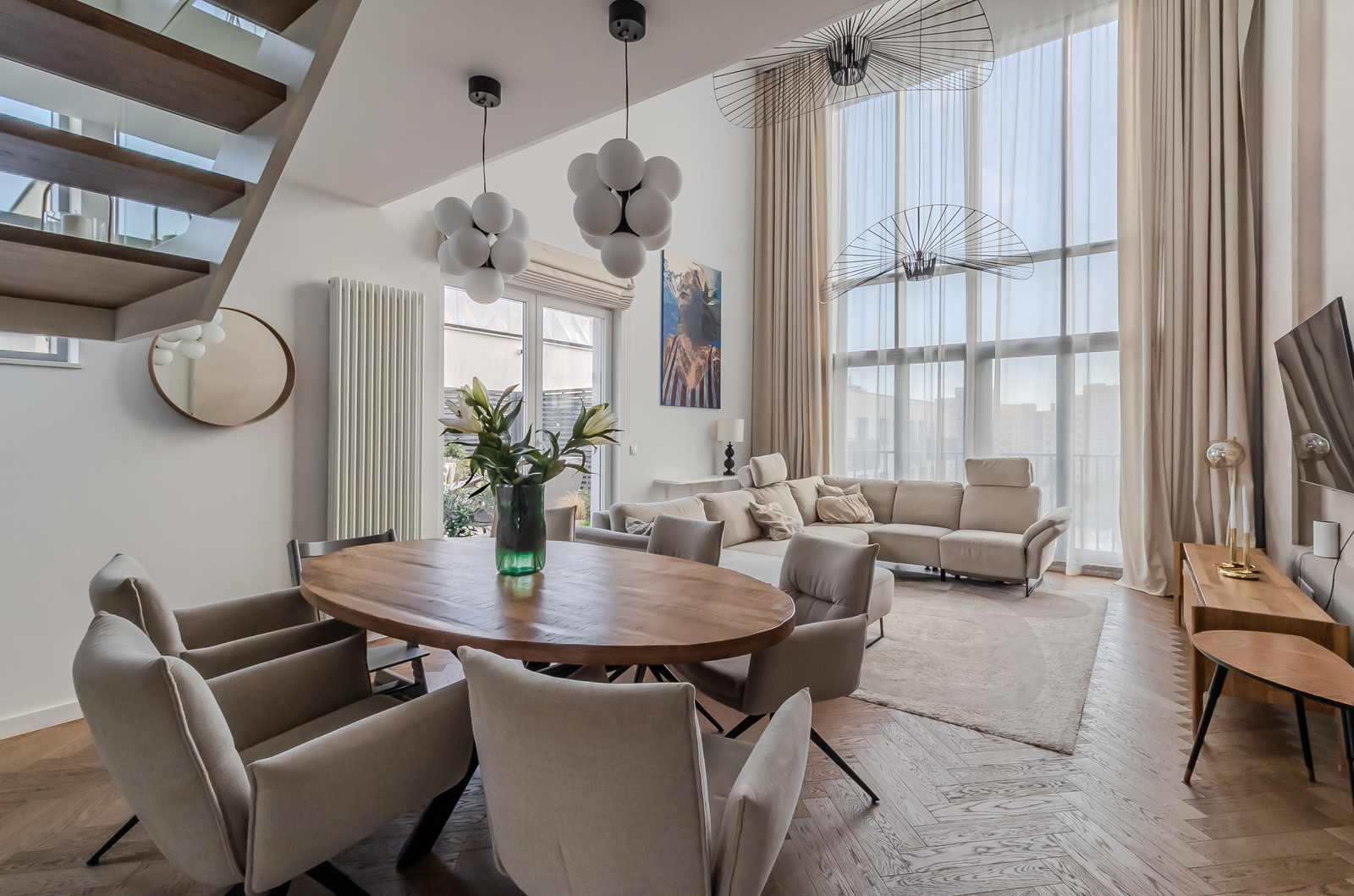 Mieszkanie znajduje się na szóstym (ostatnim) piętrze w budynku z ochroną. Jego powierzchnia to ponad 173 m2, a składają się nią trzy poziomy - niezwykle przestronna, wysoka na 6 metrów część dzienna z jadalnią i wyjściem na taras, otwarta kuchnia, trzy sypialnie, trzy łazienki oraz dwie garderoby.
