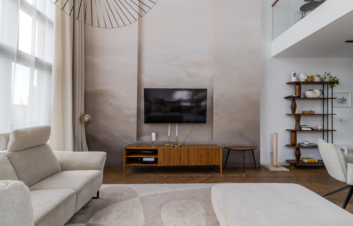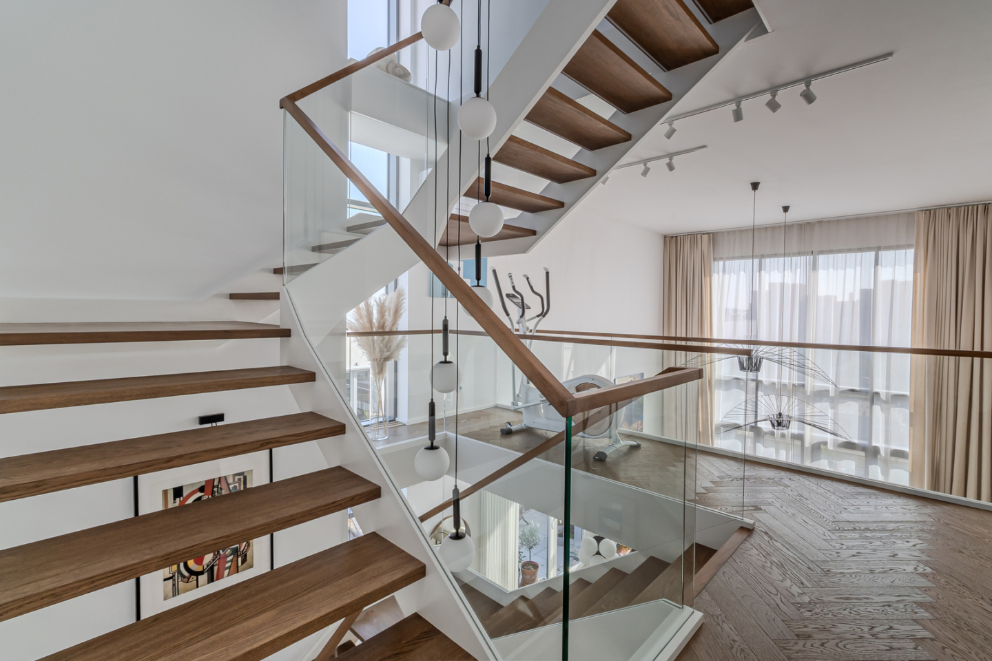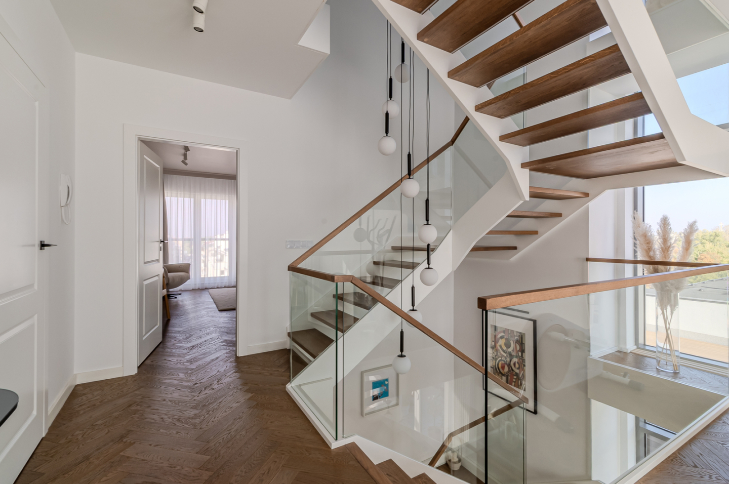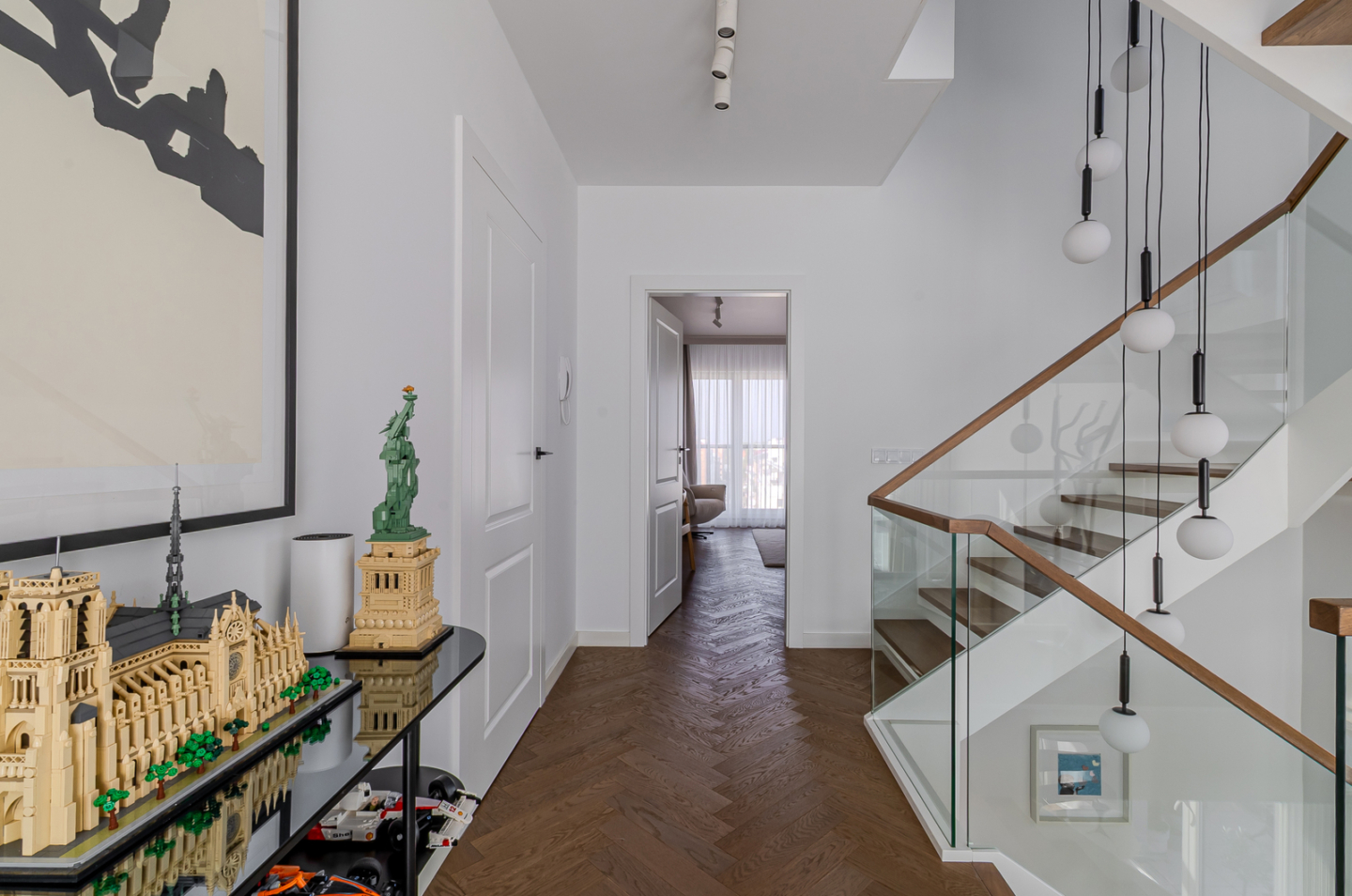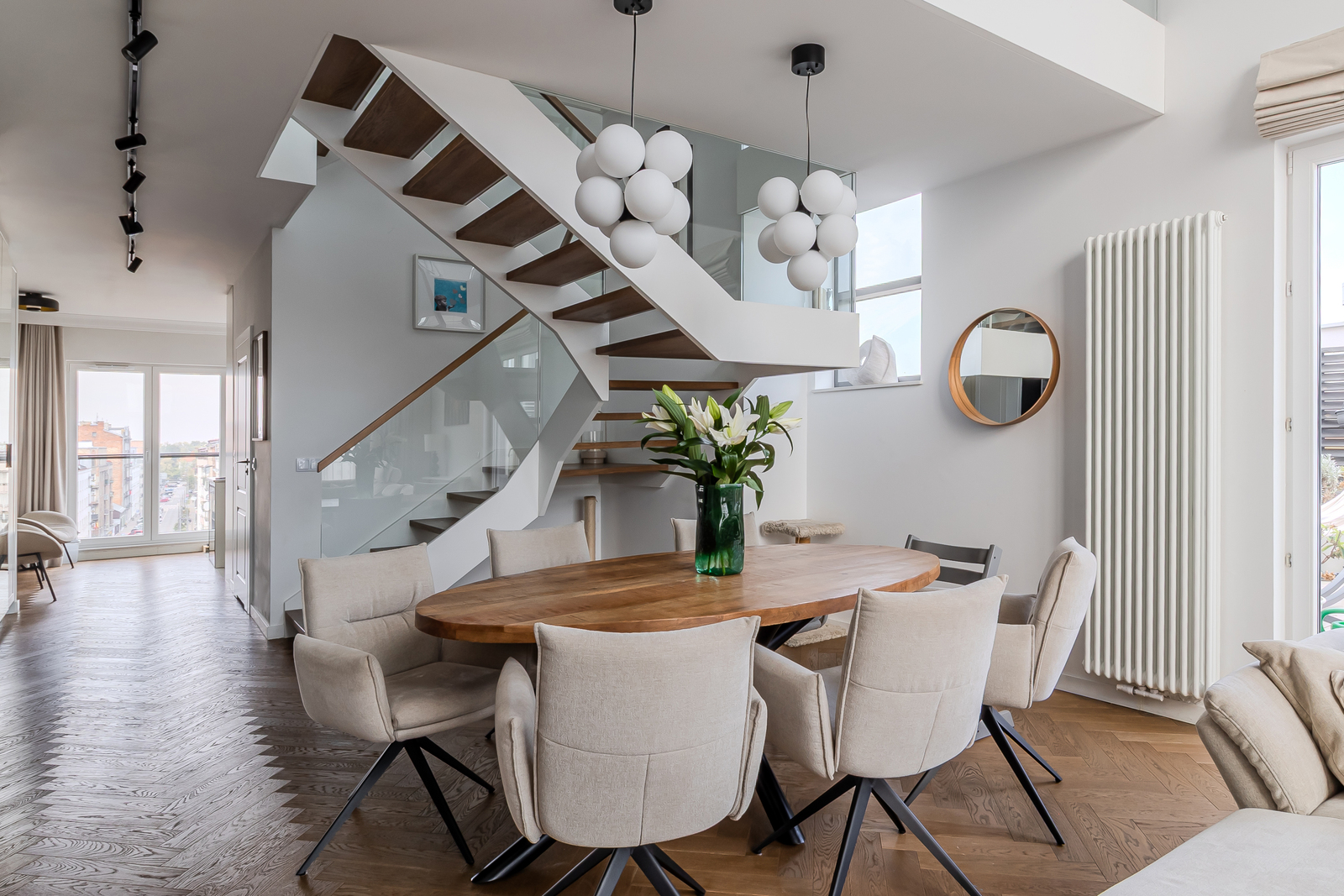 Mieszkanie znajduje się na szóstym (ostatnim) piętrze w budynku z ochroną. Jego powierzchnia to ponad 173 m2, a składają się nią trzy poziomy - niezwykle przestronna, wysoka na 6 metrów część dzienna z jadalnią i wyjściem na taras, otwarta kuchnia, trzy sypialnie, trzy łazienki oraz dwie garderoby.