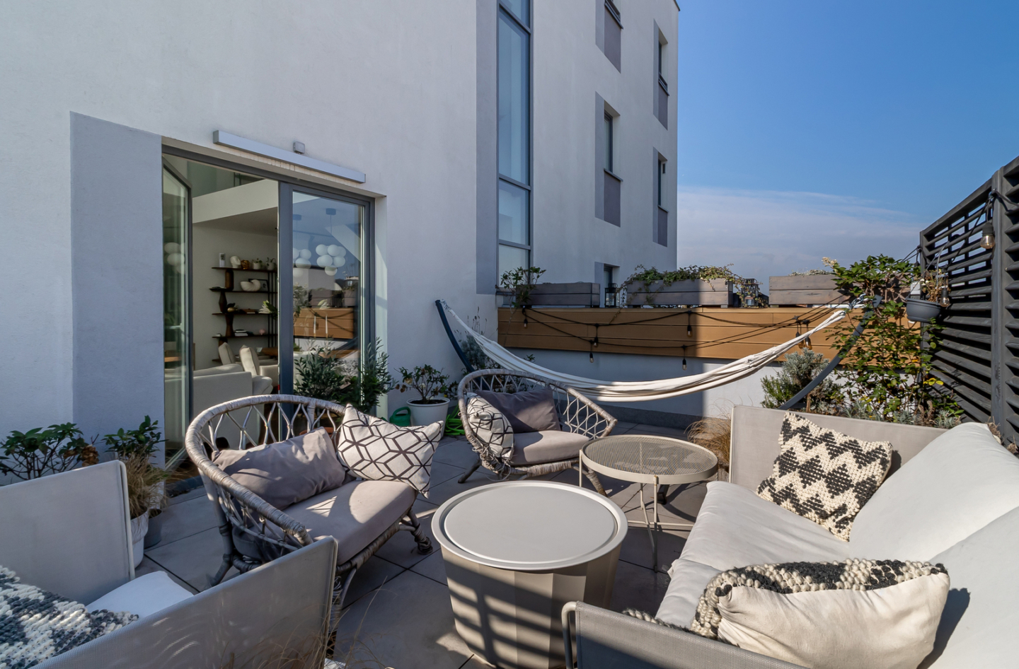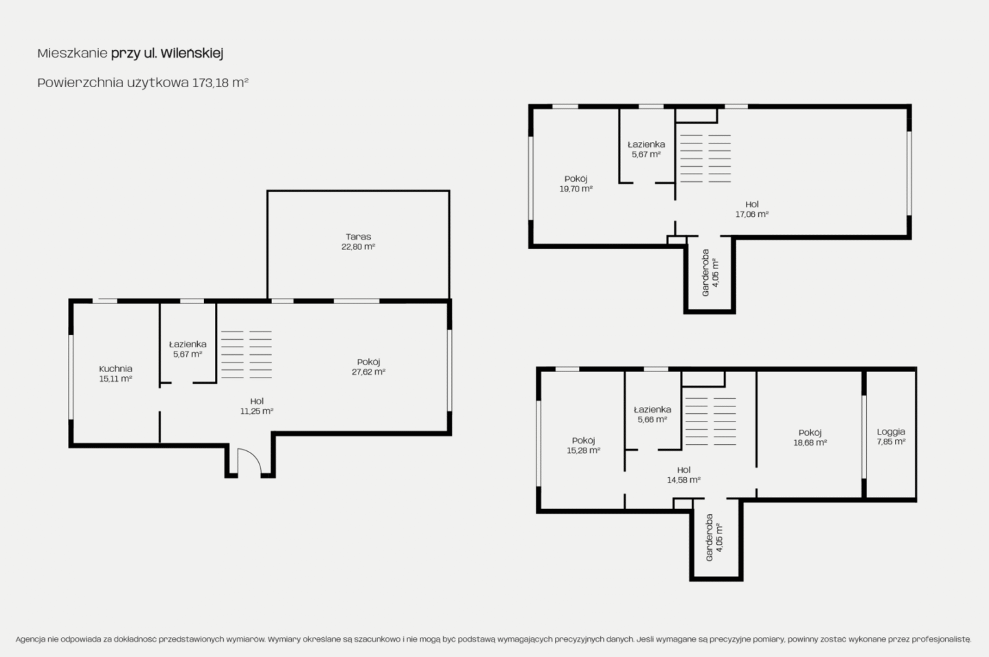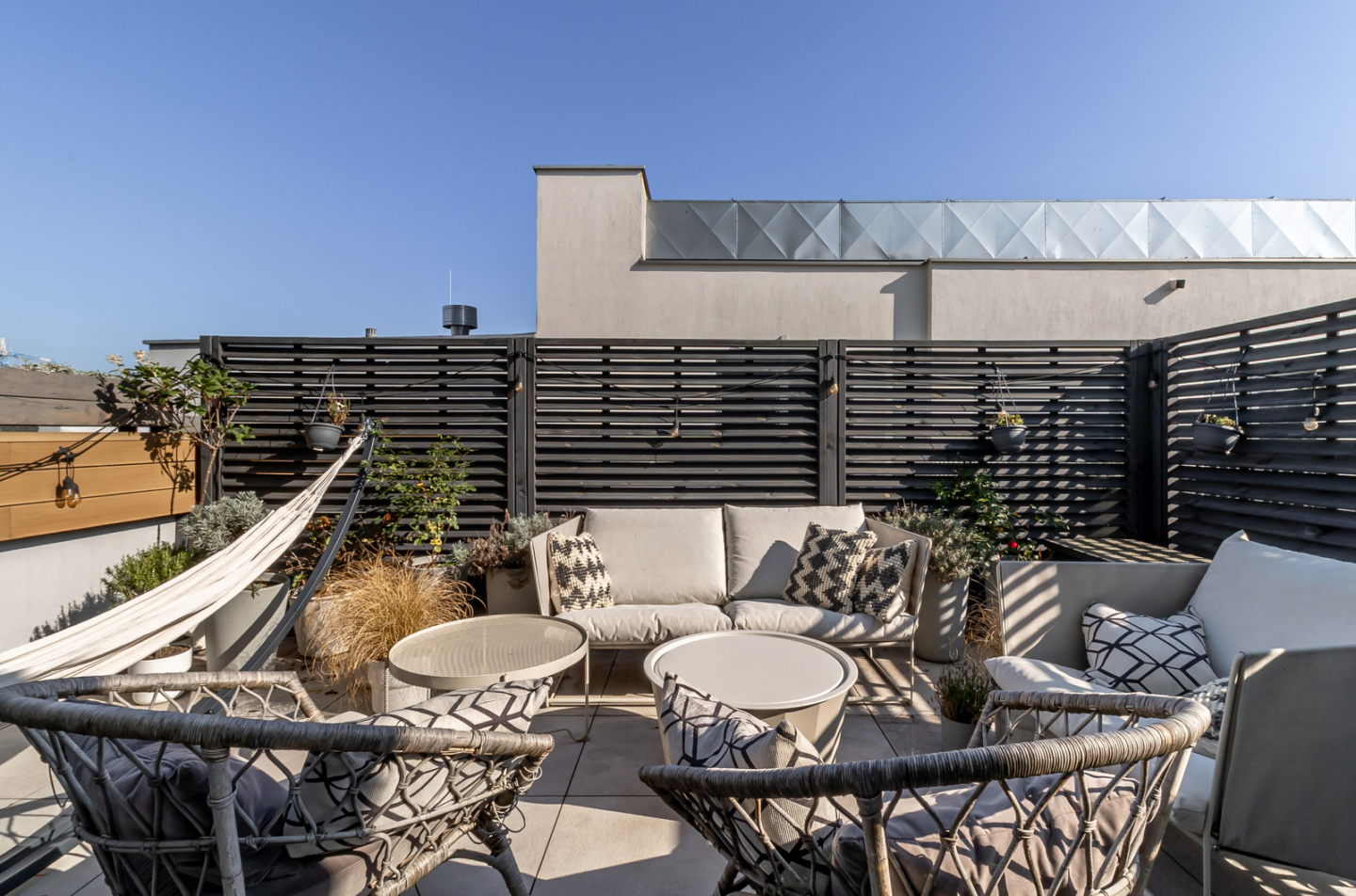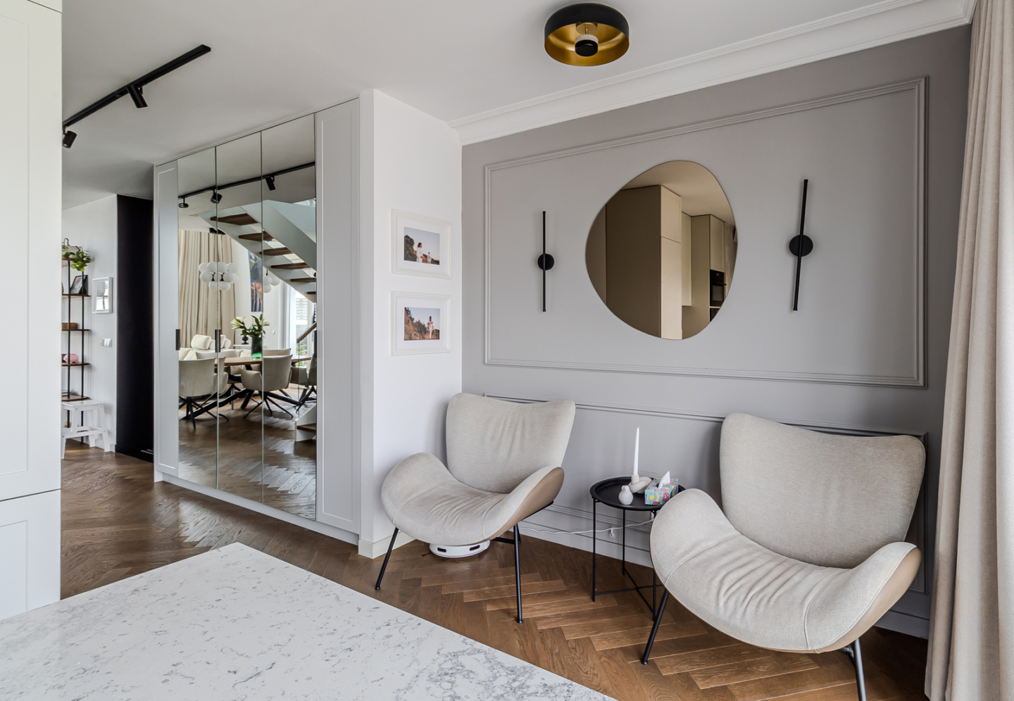Mieszkanie znajduje się na szóstym (ostatnim) piętrze w budynku z ochroną. Jego powierzchnia to ponad 173 m2, a składają się nią trzy poziomy - niezwykle przestronna, wysoka na 6 metrów część dzienna z jadalnią i wyjściem na taras, otwarta kuchnia, trzy sypialnie, trzy łazienki oraz dwie garderoby.