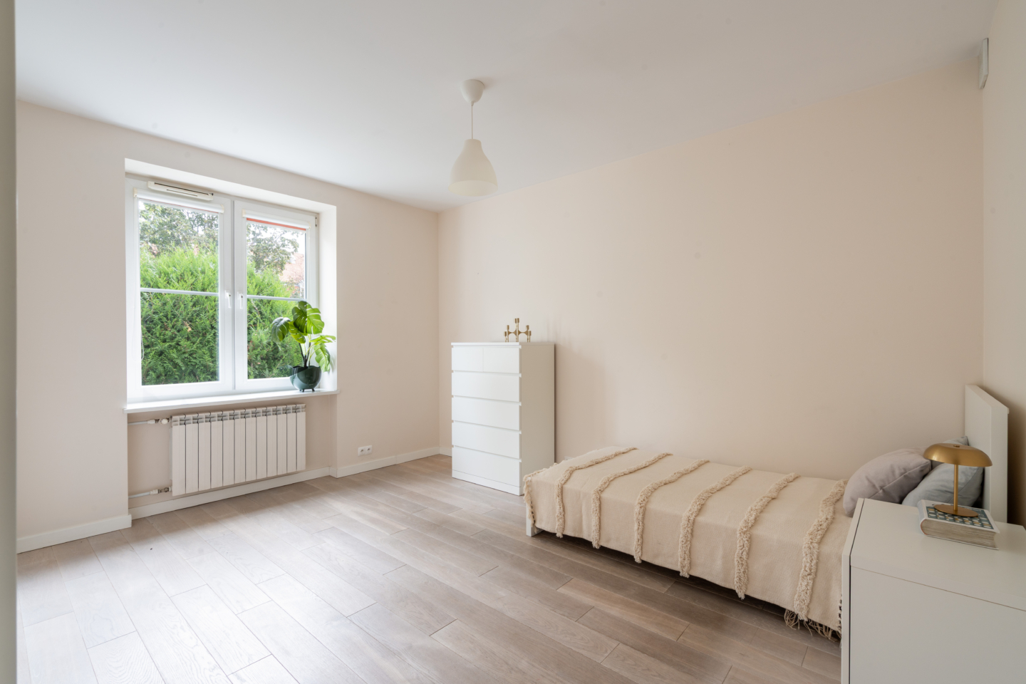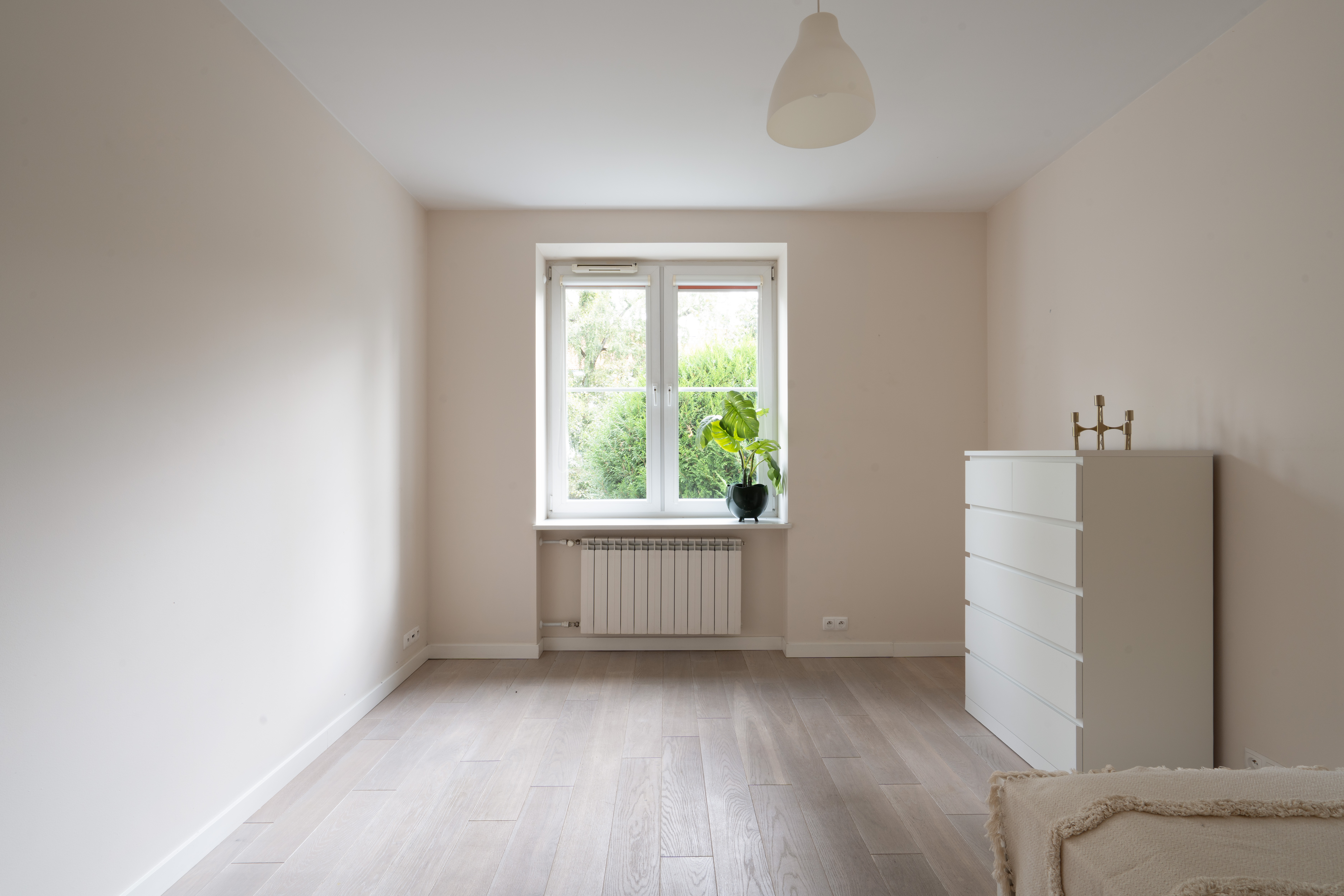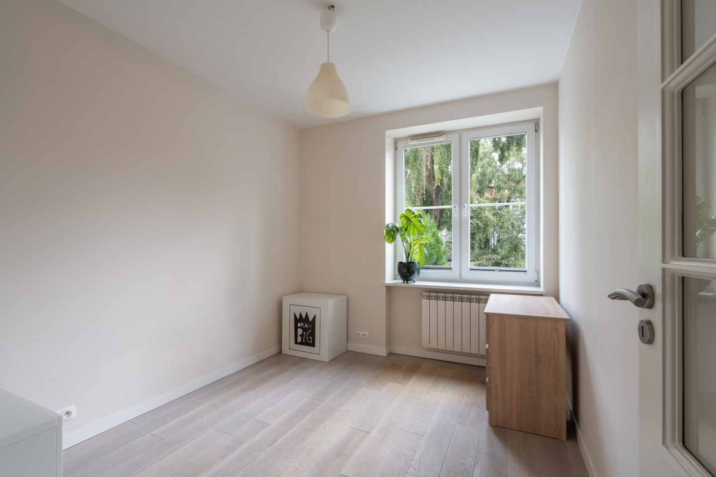 Na podłogach lita deska podłogowa – dąb bielony,, wnętrza są jasne, przytulne i gotowe do natychmiastowego zamieszkania.