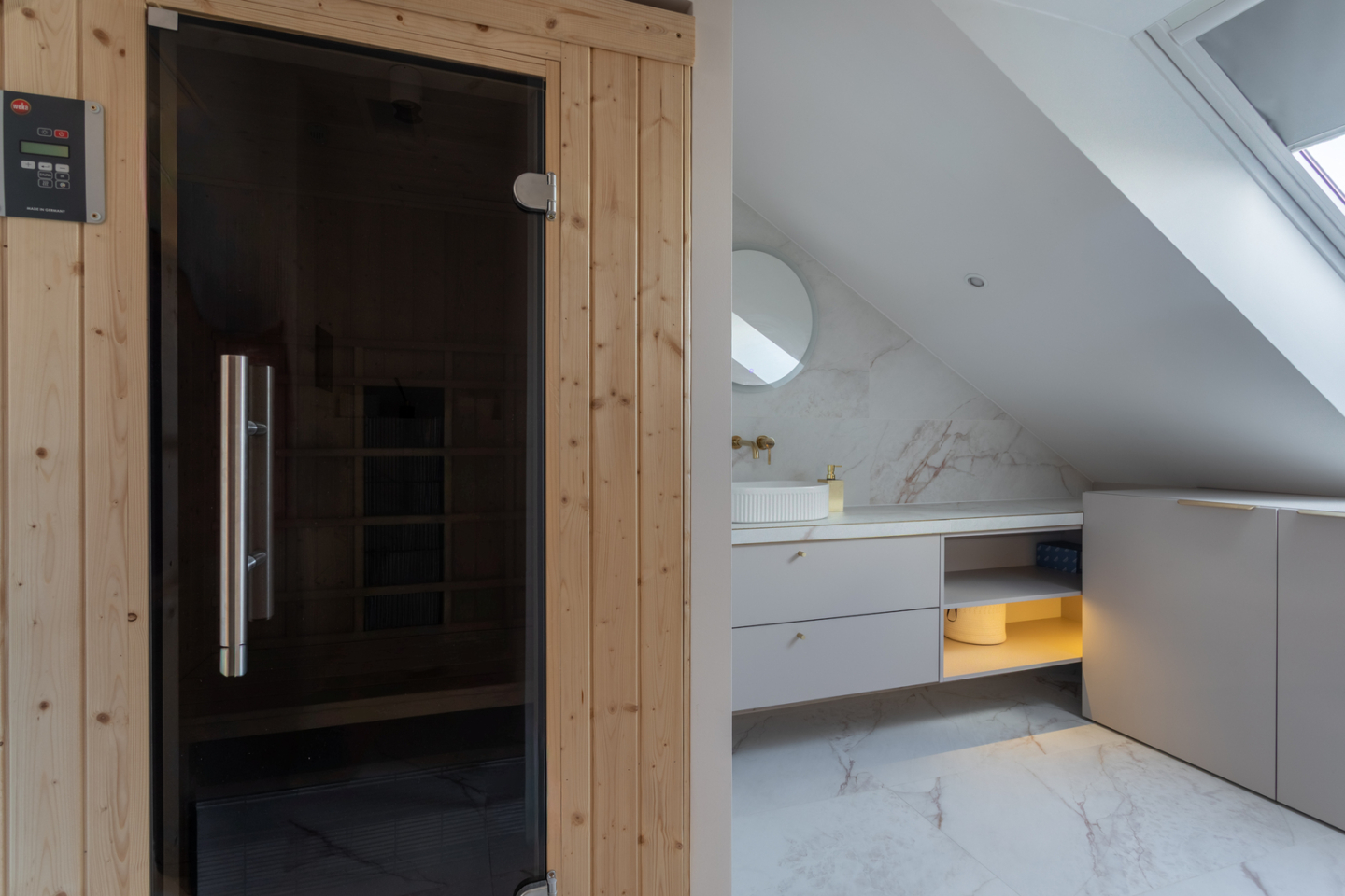 1. sypialnia z garderobą i prywatną łazienką z prysznicem i wanną, sauna