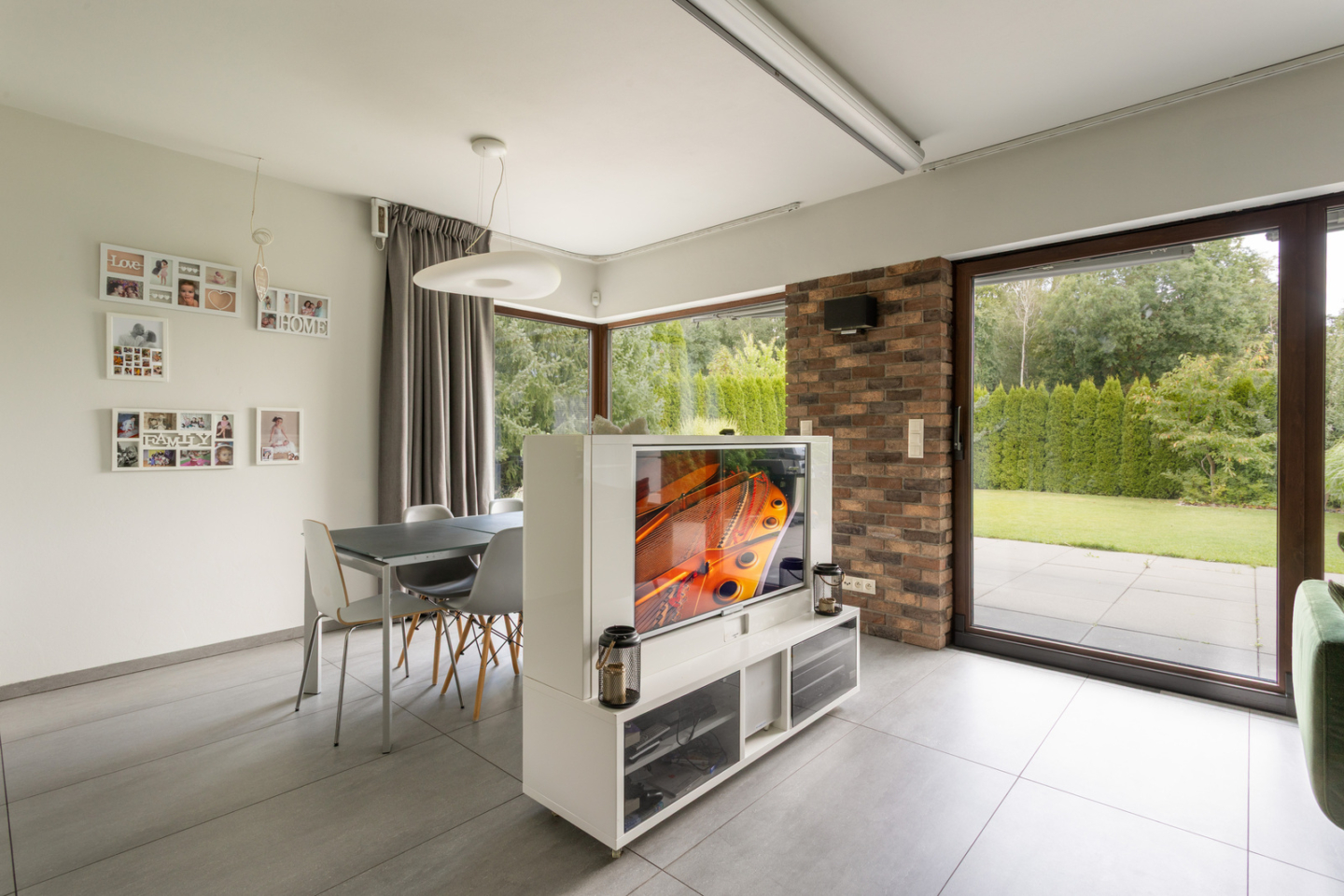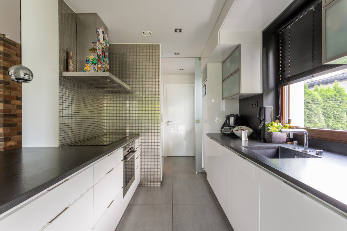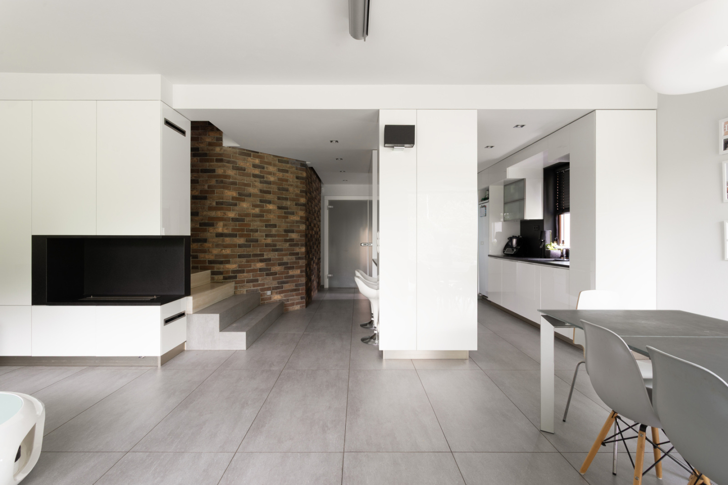 Kuchnia ze stolarką na wymiar i granitowymi blatami łączy się z jadalnią oraz salonem wyposażonym w biokominek. Przedłużeniem salonu po otwarciu okien typu HS jest 40-metrowy taras otoczony niesamowitym zielonym ogrodem, który zagląda do wnętrz i tworzy poczucie unikalnego kontaktu z naturą.
