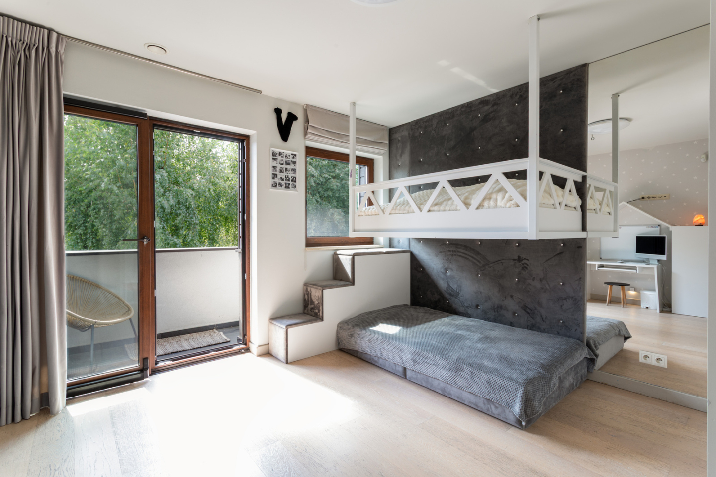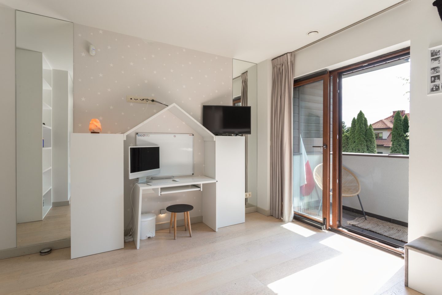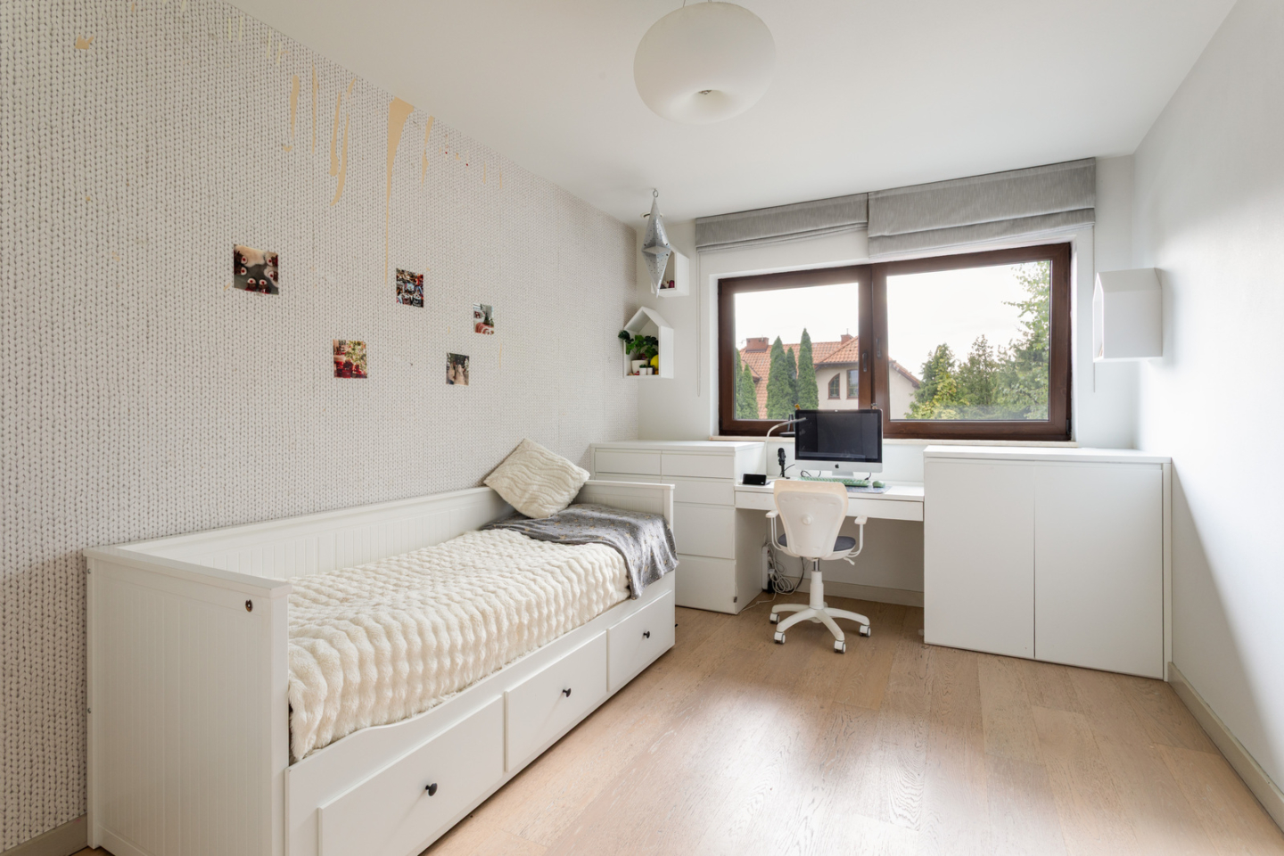 2 sypialnie dla dzieci z osobną łazienką oraz sypialnia Master z garderobą, łazienką i balkonem z widokiem na ogród.