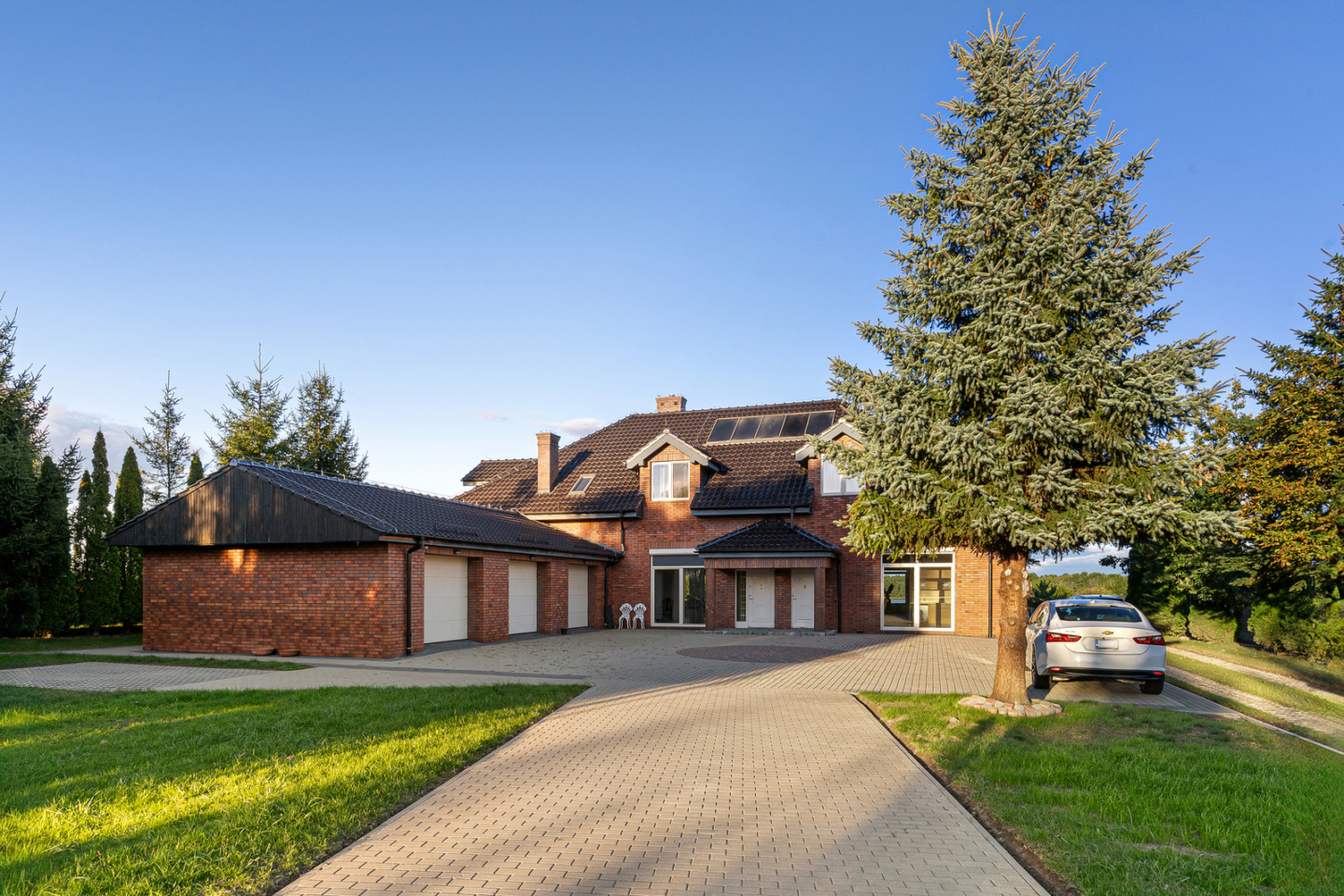 Do rezydencji przylega garaż na trzy samochody, z trzema niezależnymi bramami wjazdowymi.
