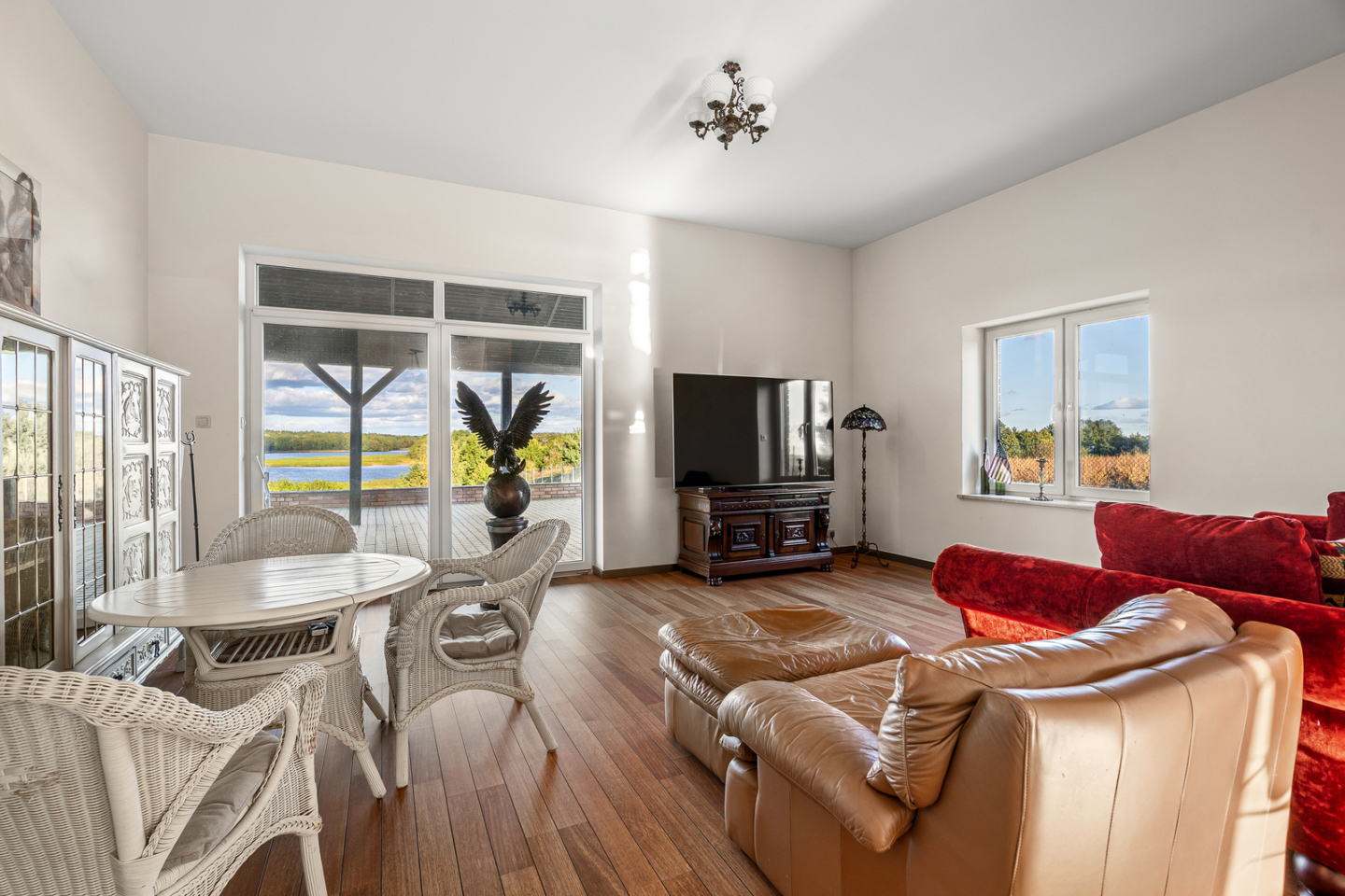 Z salonów wychodzi się na imponujący taras o powierzchni 100 m² z widokiem na ogród i jezioro.