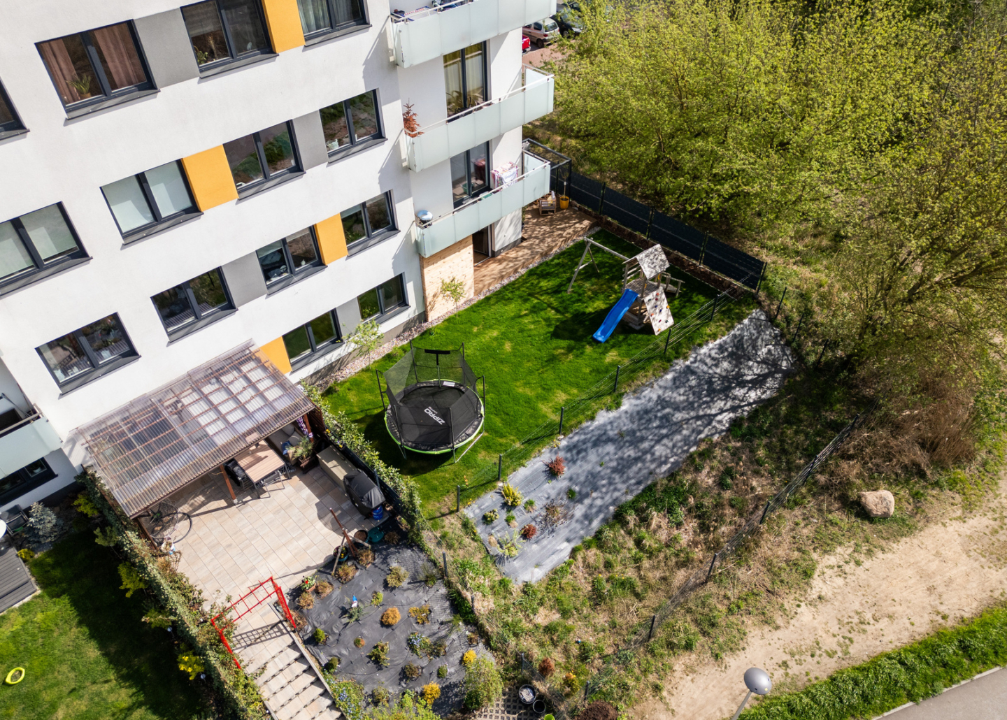 Przytulne, funkcjonalne i świetnie przemyślane trzy pokoje mieszkanie o powierzchni 67,07 mkw. Dwie osobne sypialnie (10 mkw i 13,5 mkw), w tym jedna z garderobą stwarzają wygodę i przestrzeń każdemu domownikowi, ale centralnym punktem mieszkania jest jasny 32 metrowy salon połączony z otwartą kuchnią. To właśnie z tej części wychodzi się bezpośrednio na 242 metrowy ogród – zieloną oazę, która latem staje się naturalnym przedłużeniem salonu. Umeblowany taras jest wprost stworzony z myślą o porannej kawie w słońcu czy wieczornej kolacji pod gołym niebem. A zielona część ogródka będzie wymarzonym miejscem dla dzieci do popołudniowych zabaw na trampolinie, biegania czy gry w piłkę.