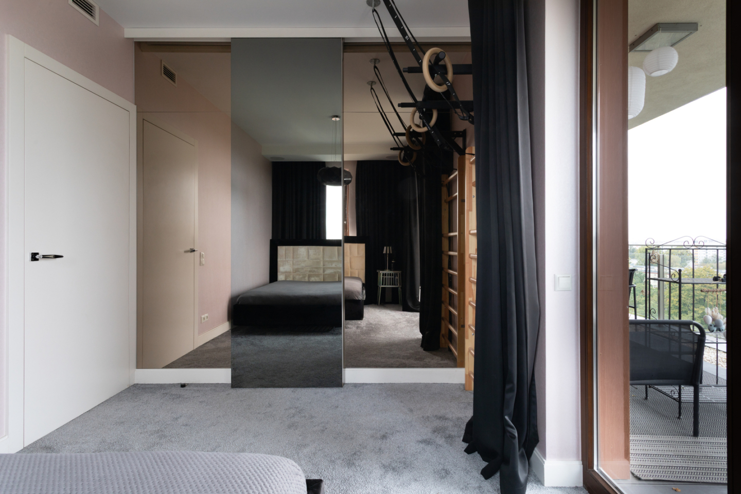 - W sypialni duże łóżko małżeńskie i garderoba ukryta za lustrami