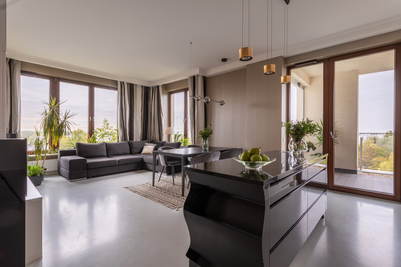 - przestronny salon z otwartą kuchnią – 30,48 mkw,