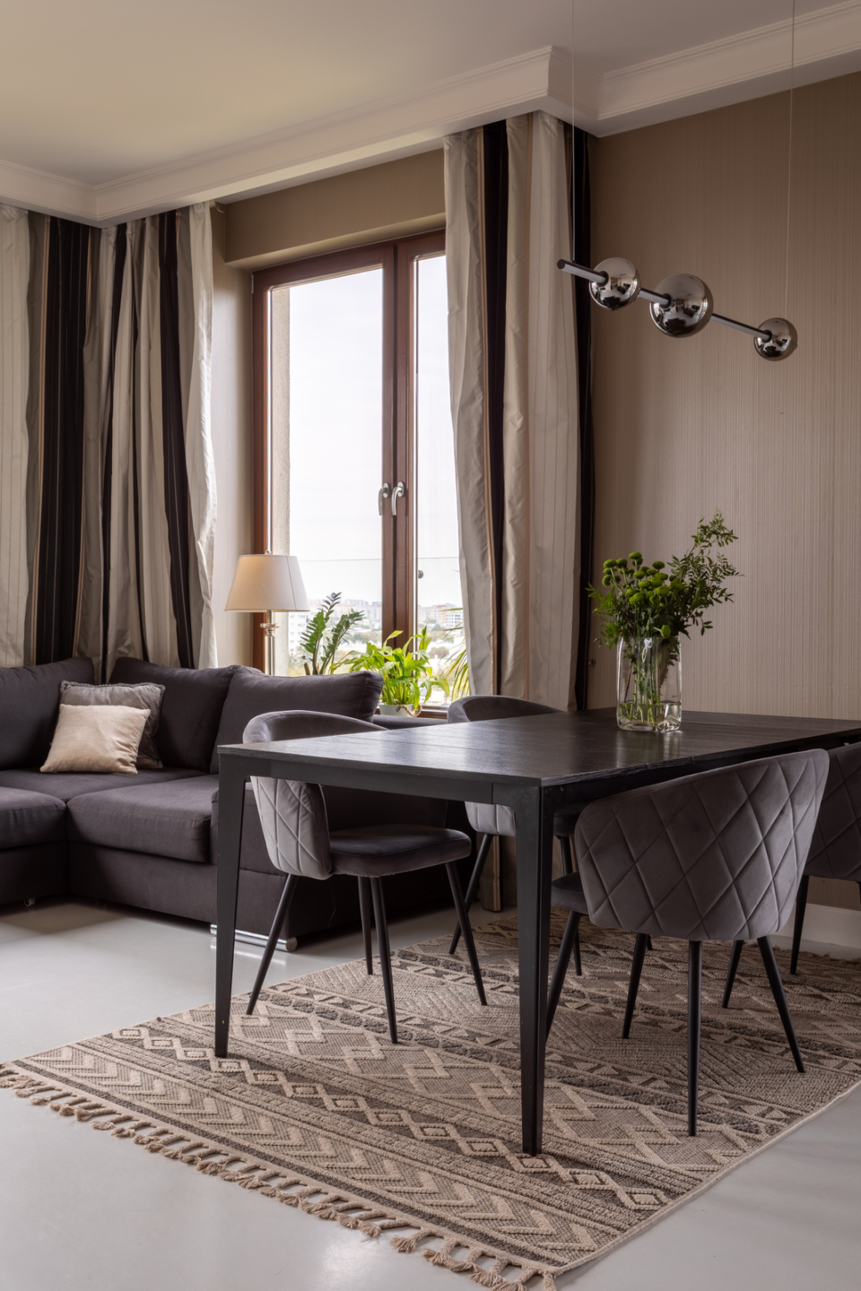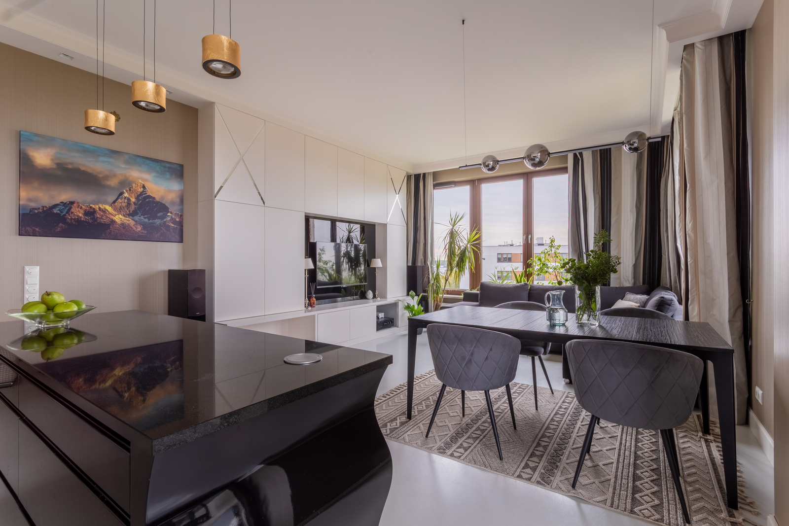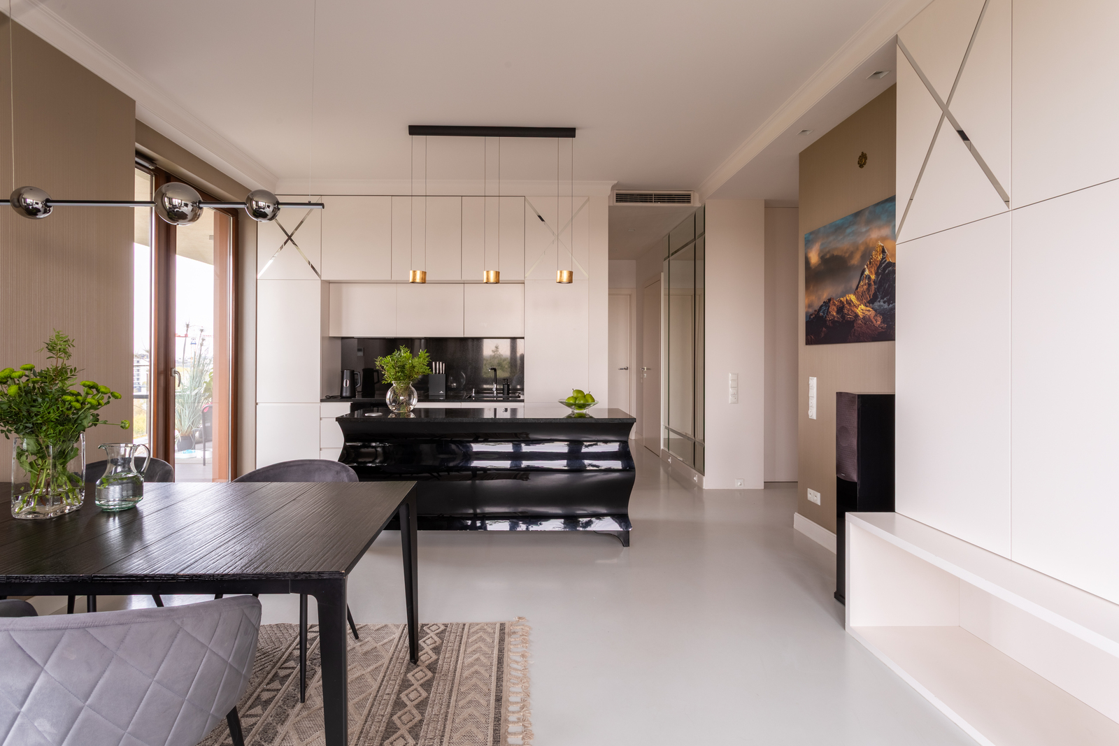 Mieszkanie wykończono w wysokim standardzie i w spójnym, eleganckim stylu. Całość tworzy nowoczesną, harmonijną przestrzeń, w której można zamieszkać od razu, bez żadnych nakładów. Jasne, ciepłe kolory tworzą przytulny klimat, a każdy detal został starannie przemyślany: