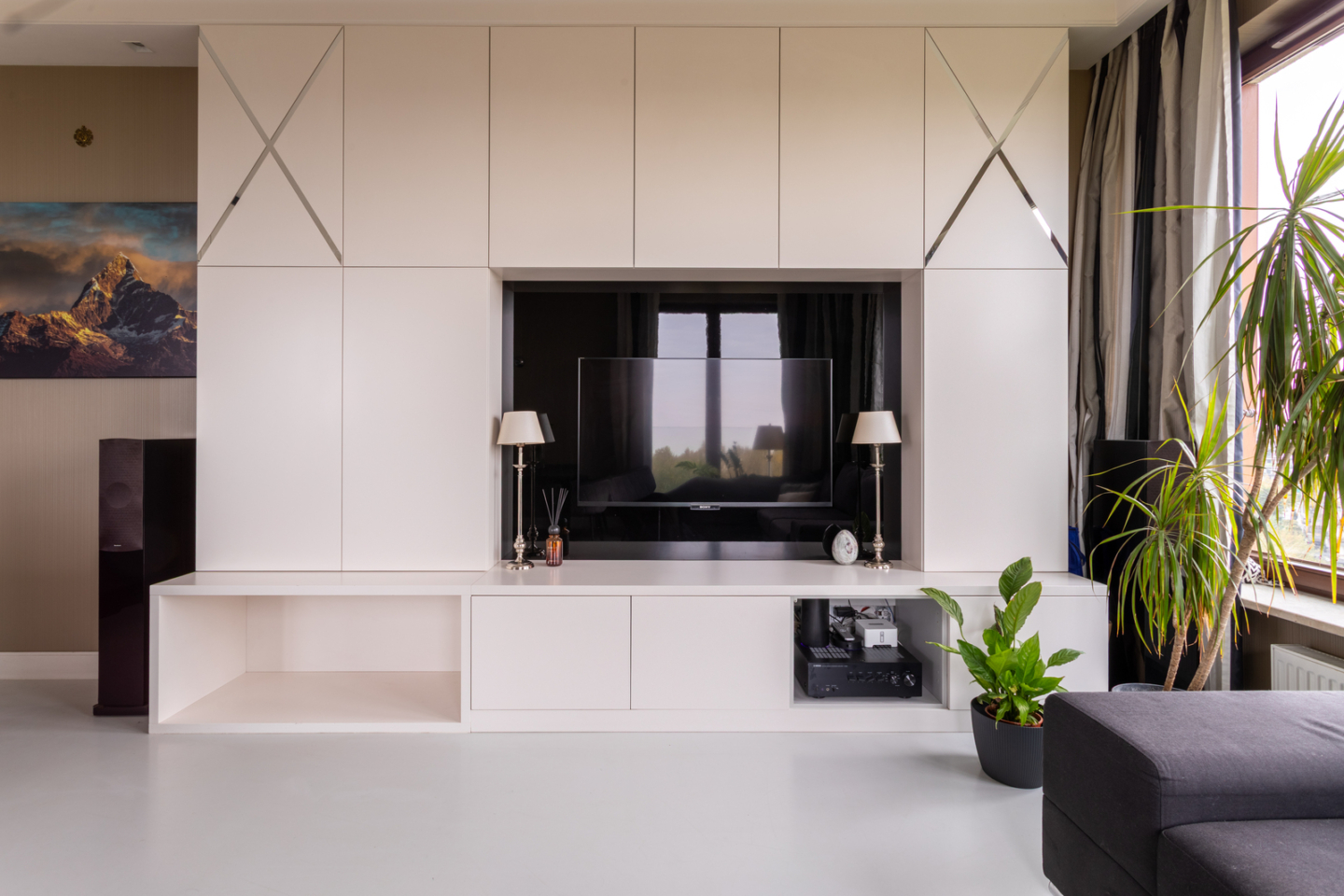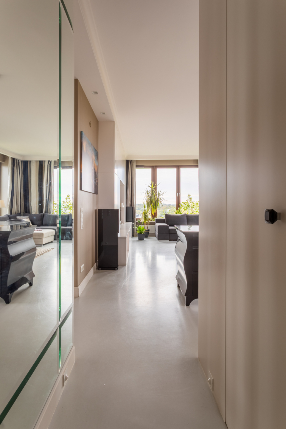 - W salonie, kuchni i przedpokoju zastosowano wylewkę poliuretanową, w sypialni – miękką wykładzinę, a w pokoju dzieci panele