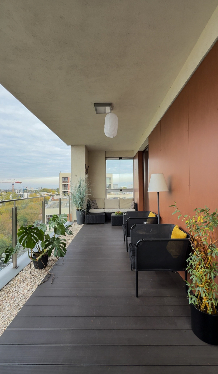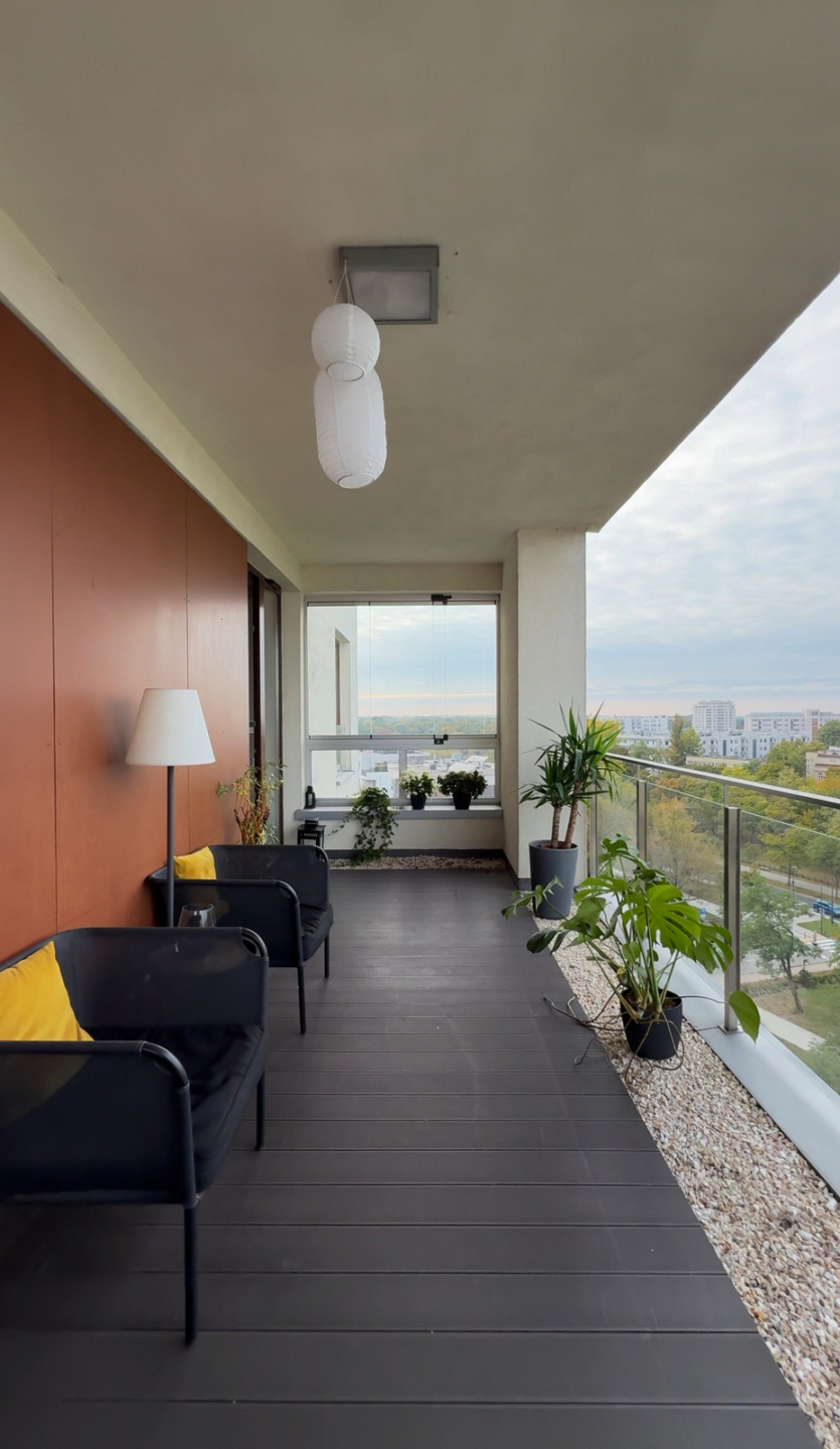 Z salonu prowadzi wyjście na dużą, słoneczną loggię o powierzchni ponad 19 mkw – idealną na poranną kawę lub letnie kolacje z widokiem na zieleń.